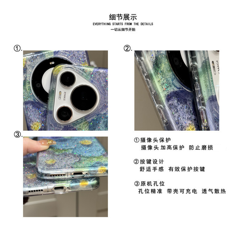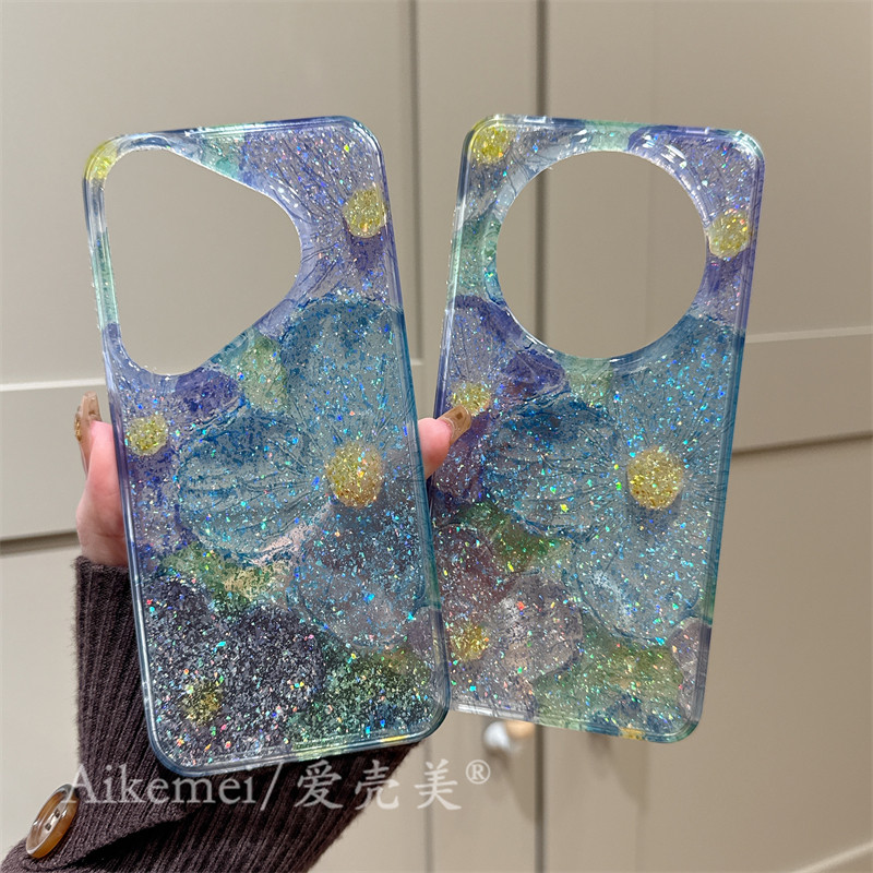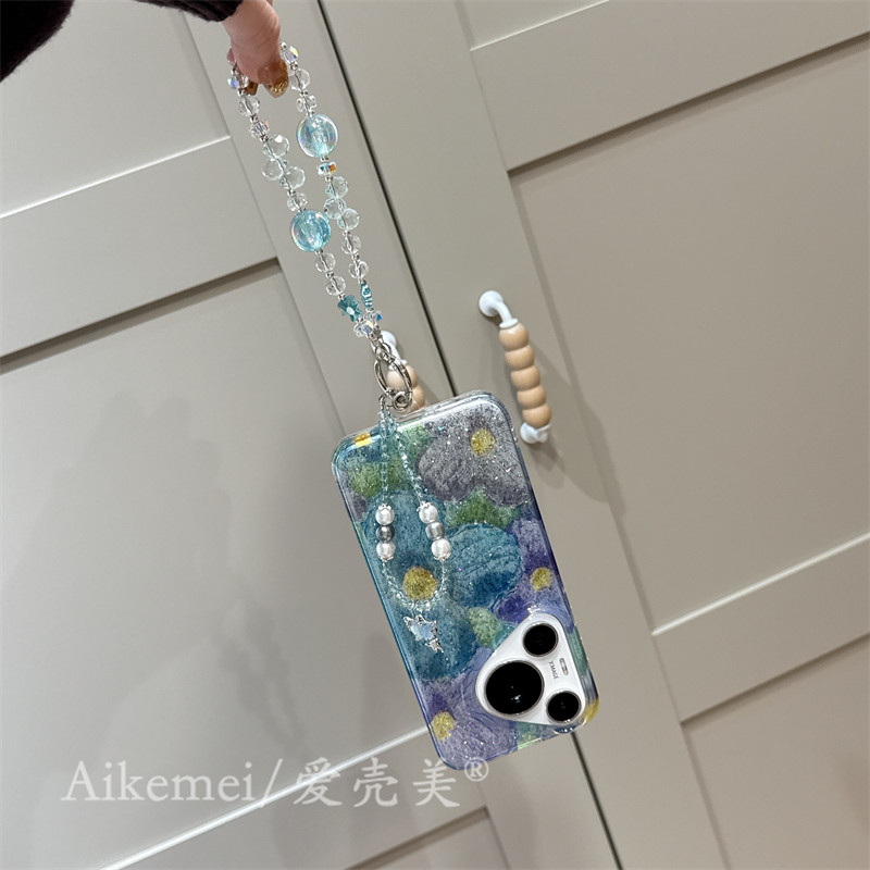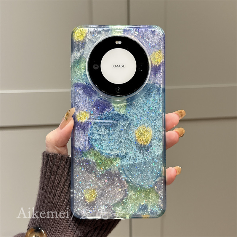 适用华为mate70pro+手机壳日韩半透闪粉油画花朵Mate60pro+链条挂绳Mate70新款双层pura70pro+全包防摔女款软