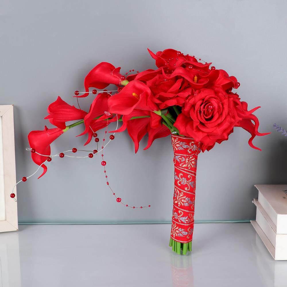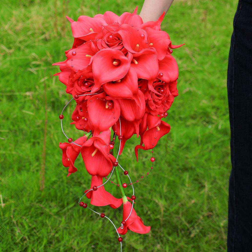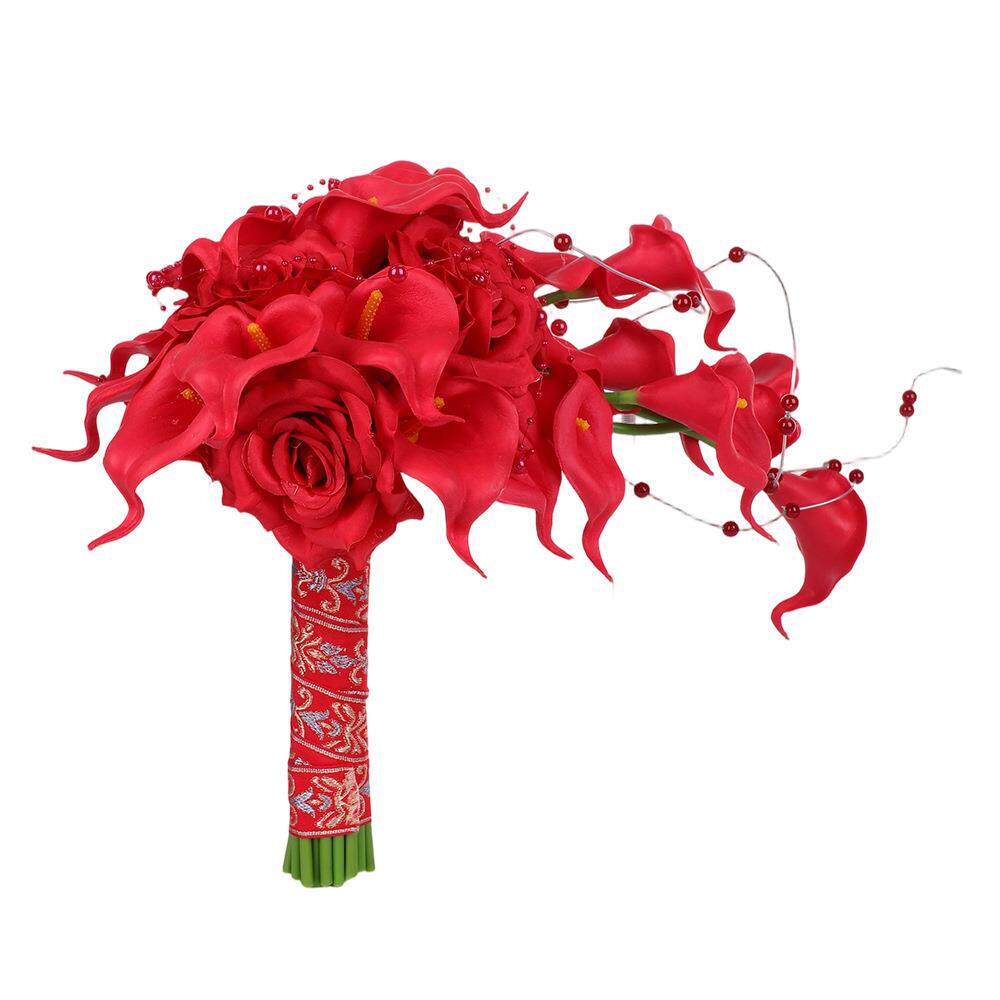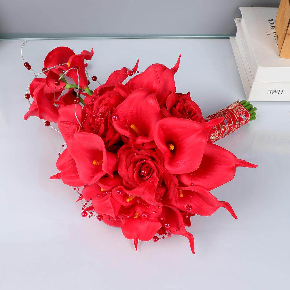 红色仿真马蹄莲玫瑰瀑布手捧花婚礼新娘带珠装饰假花婚庆摄影道具