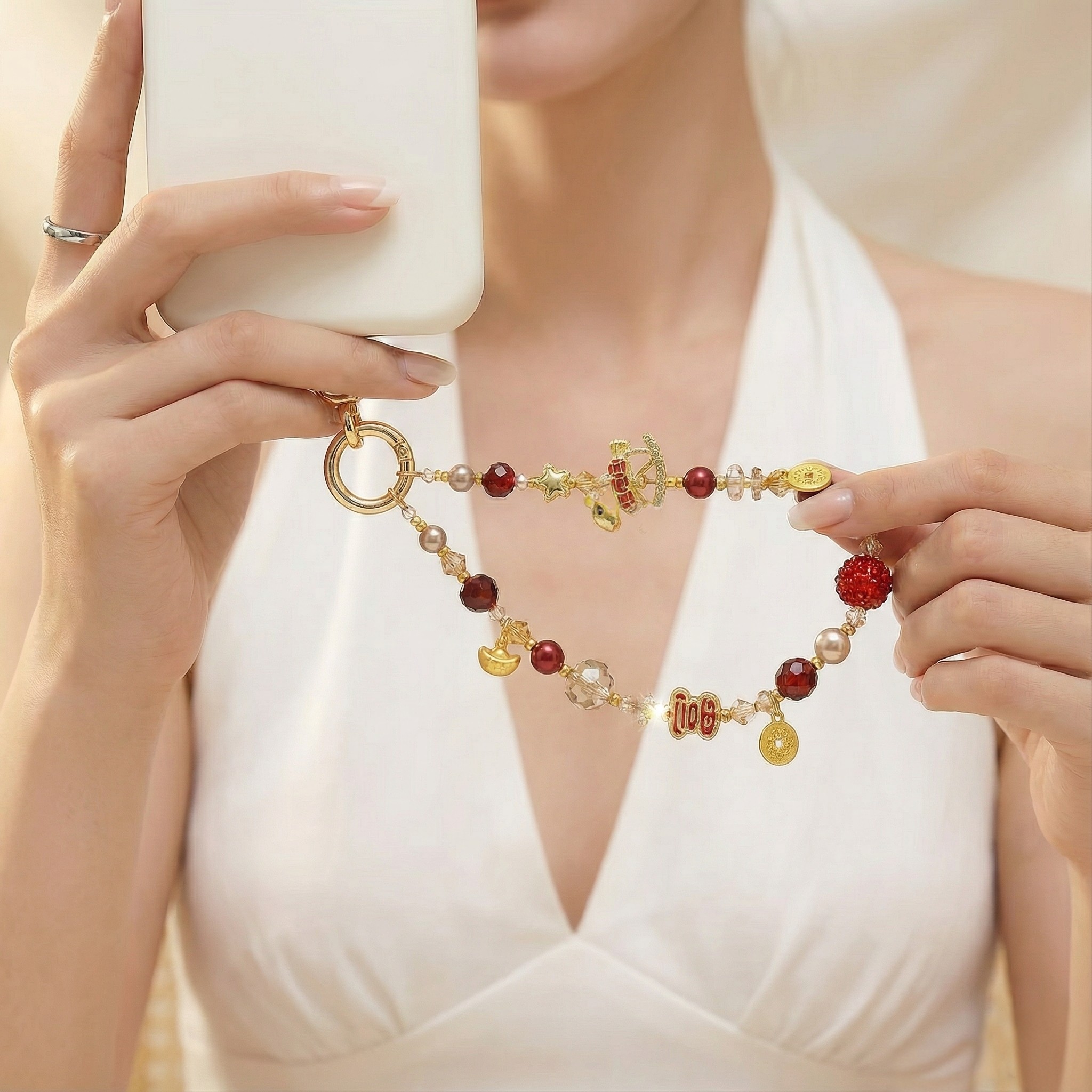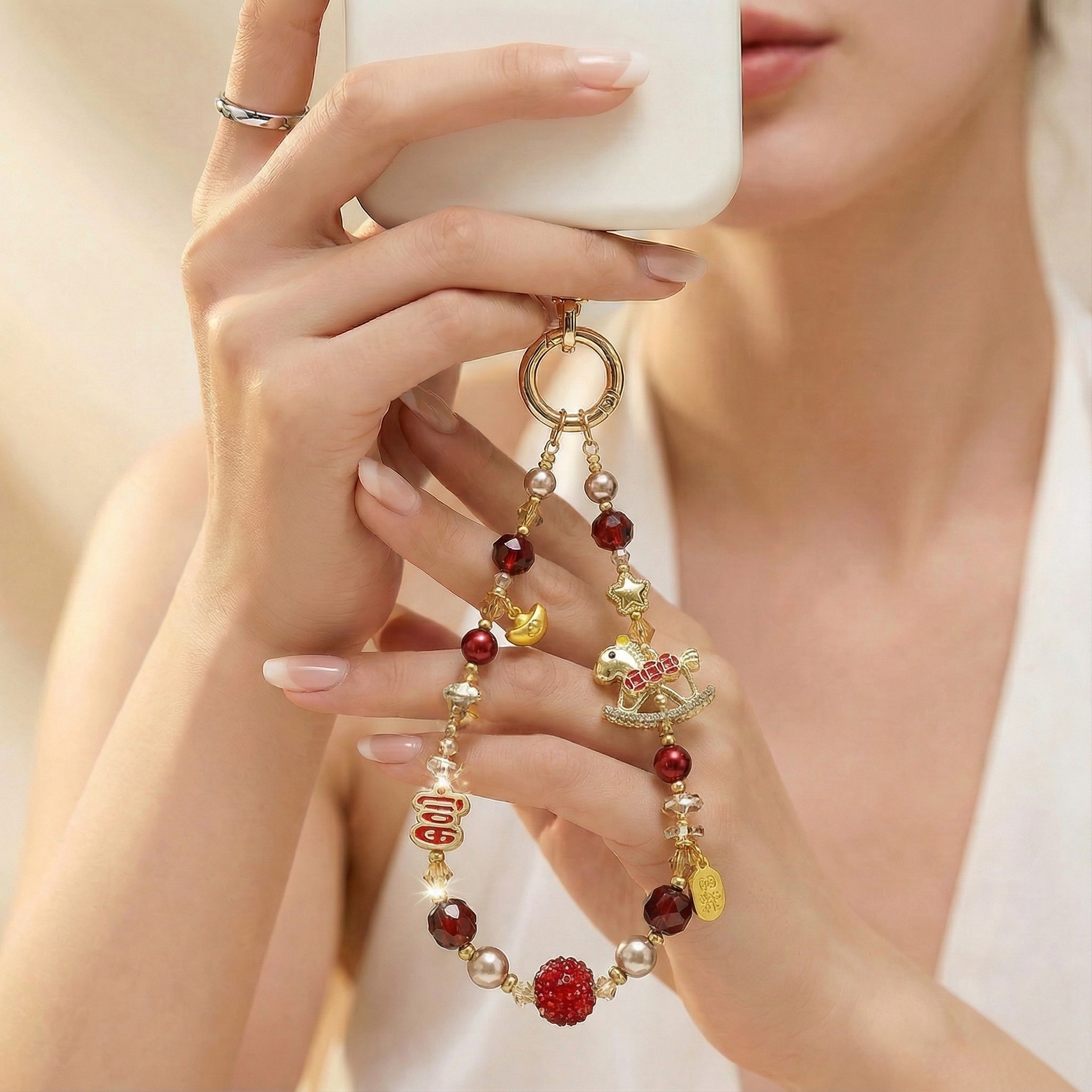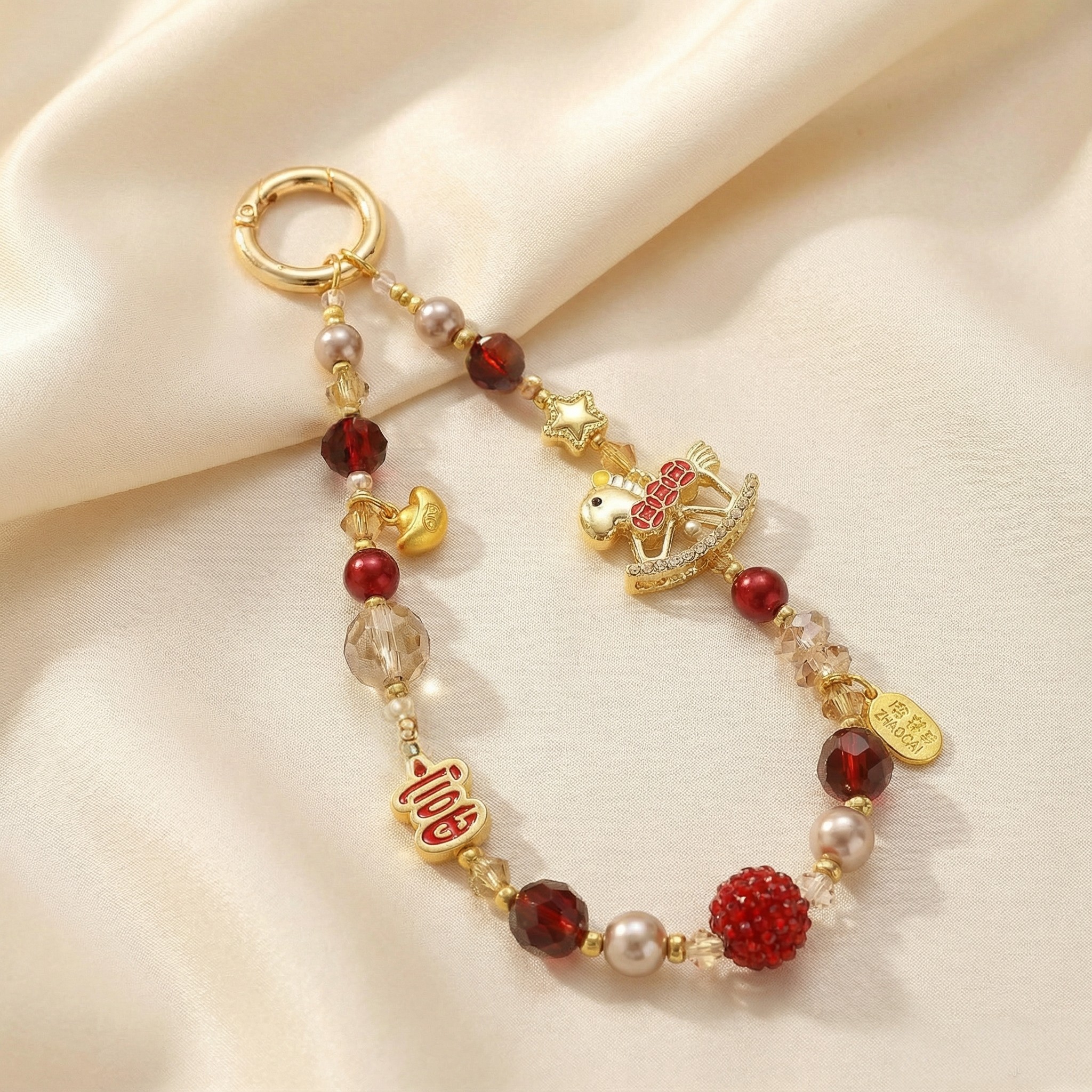 新年中式红色水晶珍珠小马聚财手机链挂手腕挂绳挂饰配件挂件马年
