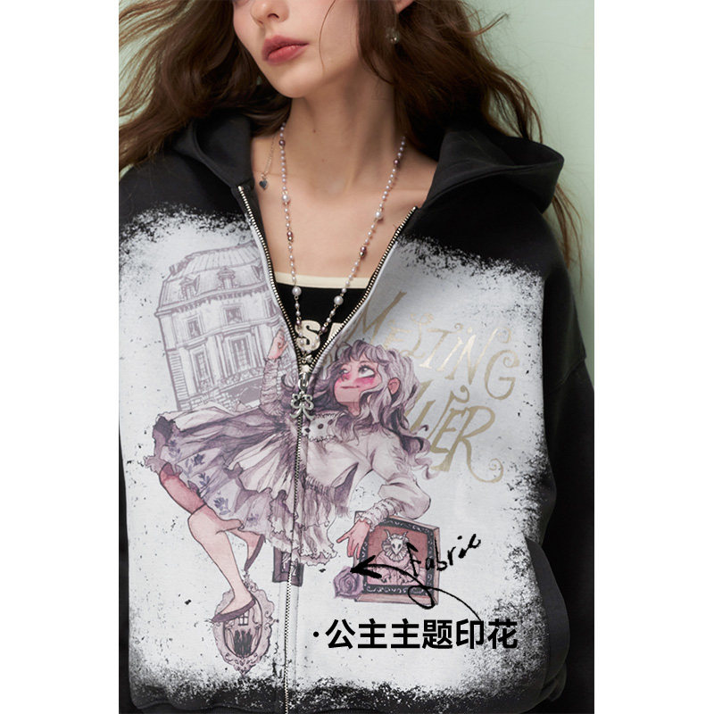 妖精的口袋原创插画满印黑色连帽外套女2026早春新款宽松卫衣外套