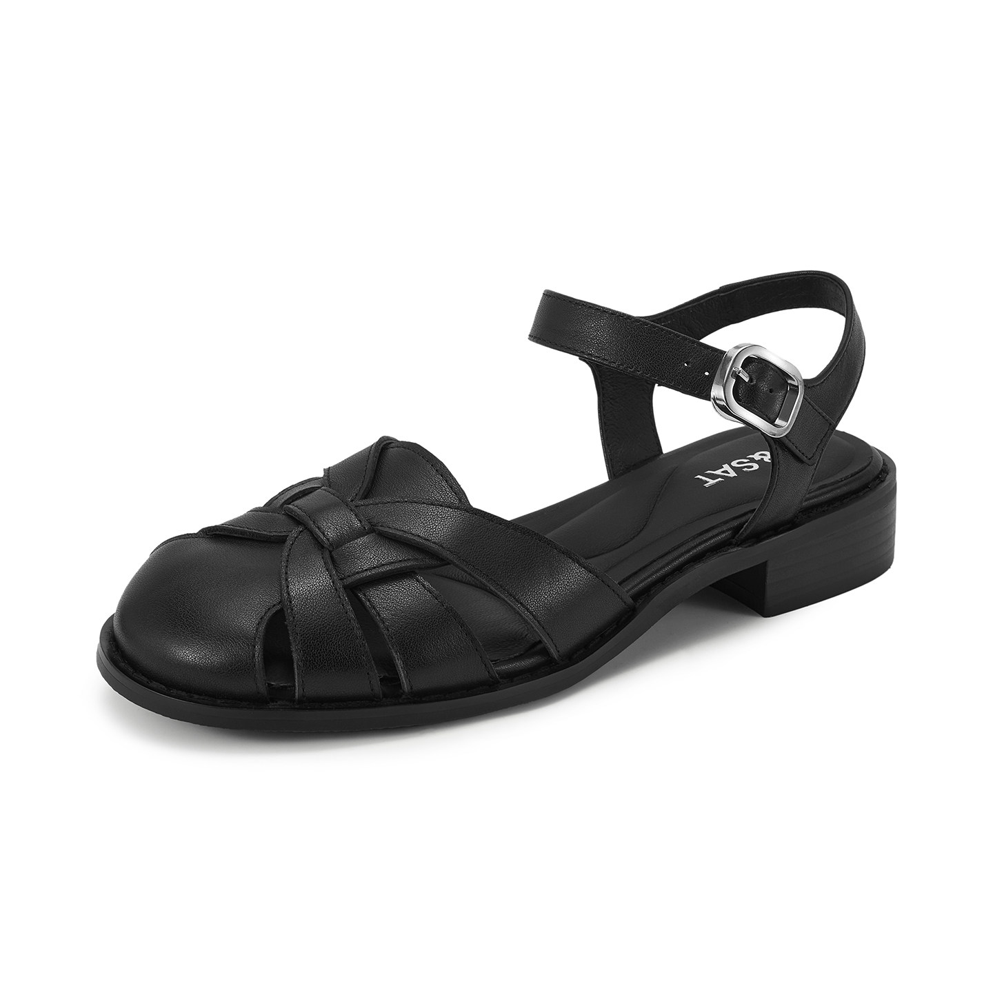 星期六夏季新款黑色包头罗马凉鞋女平底镂空真皮软底不累脚单鞋