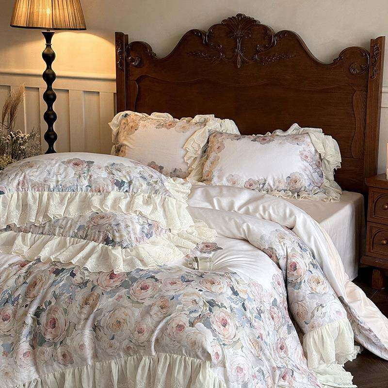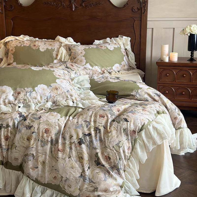 秋冬新款法式天丝棉磨毛雪纺花边四件套家用舒适1.8m床上用品套件