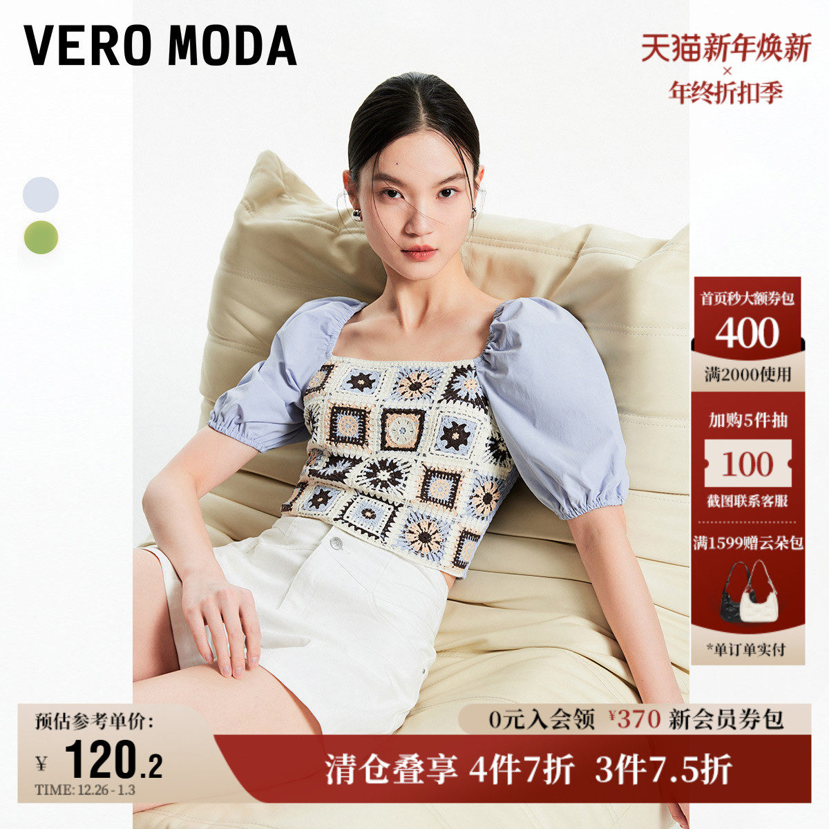 Vero Moda奥莱T恤女秋季新款甜美针织拼接钩花松紧泡泡袖上衣流行