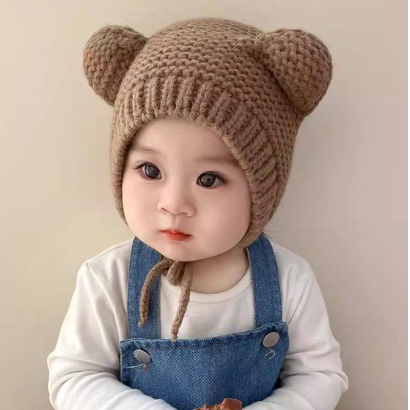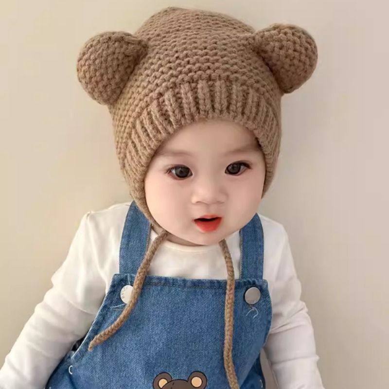 婴儿帽子秋冬款ins网红可爱小熊耳朵超萌男女宝宝护耳毛线帽