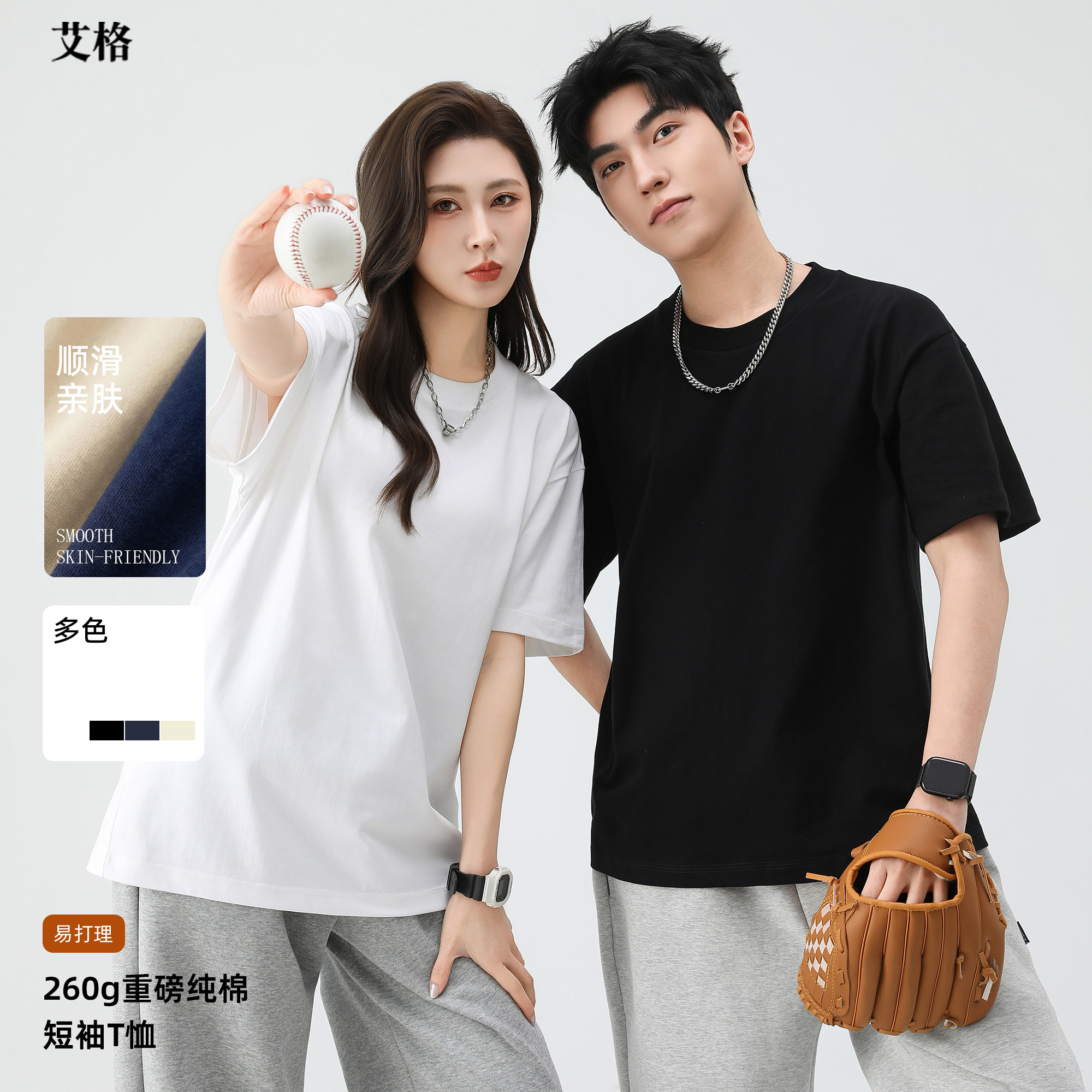 艾格 260G精梳棉重磅短袖T恤男女同款夏新款纯色情侣T恤