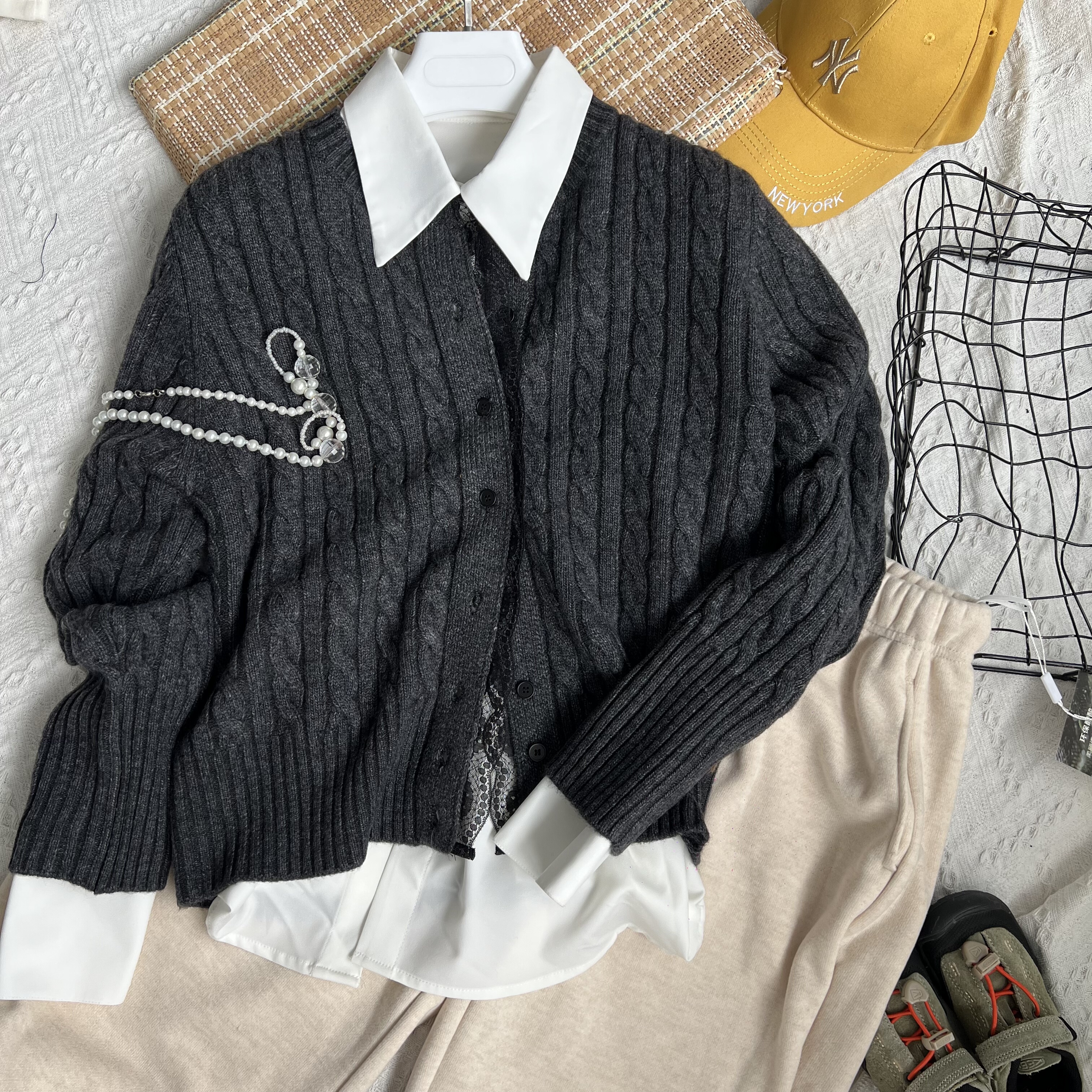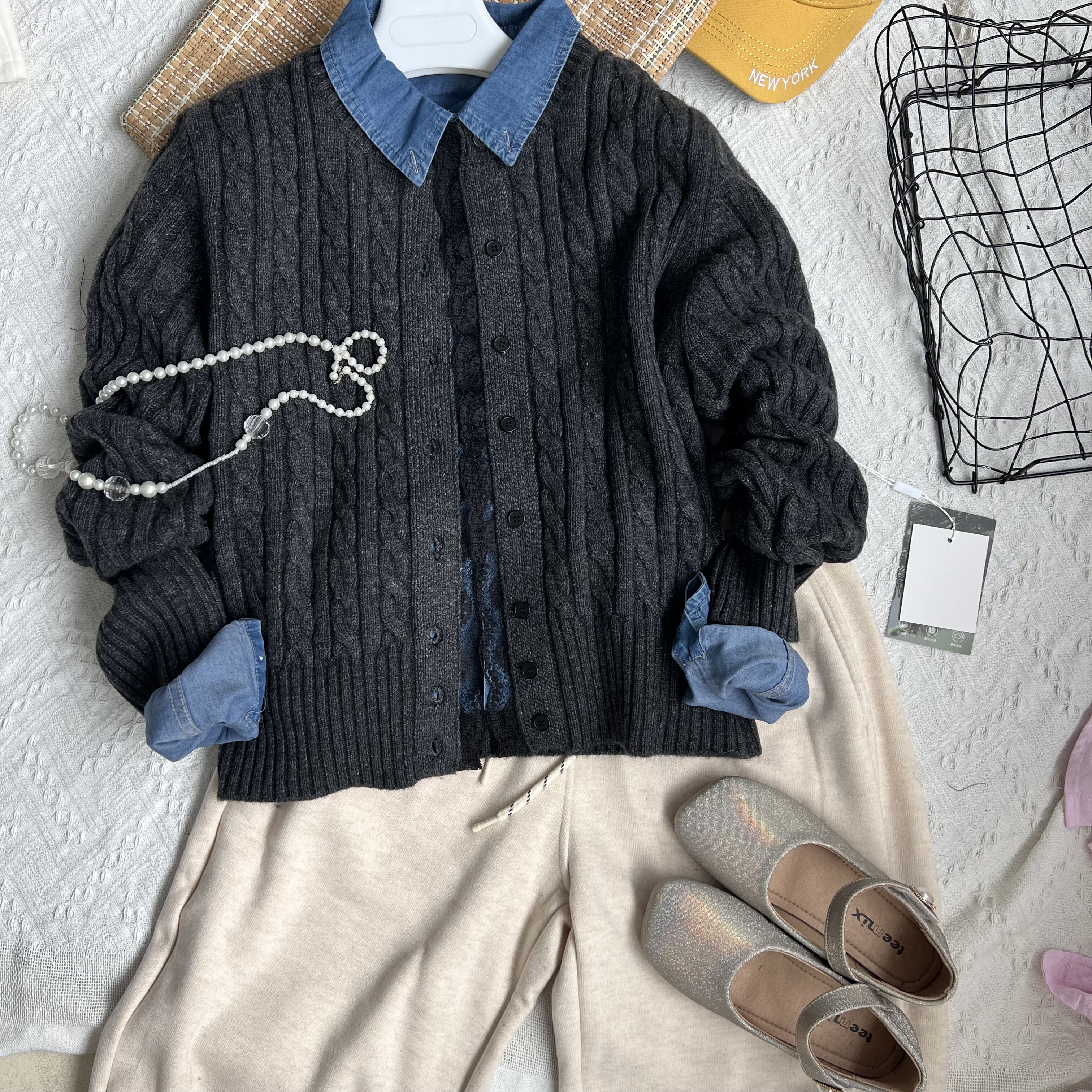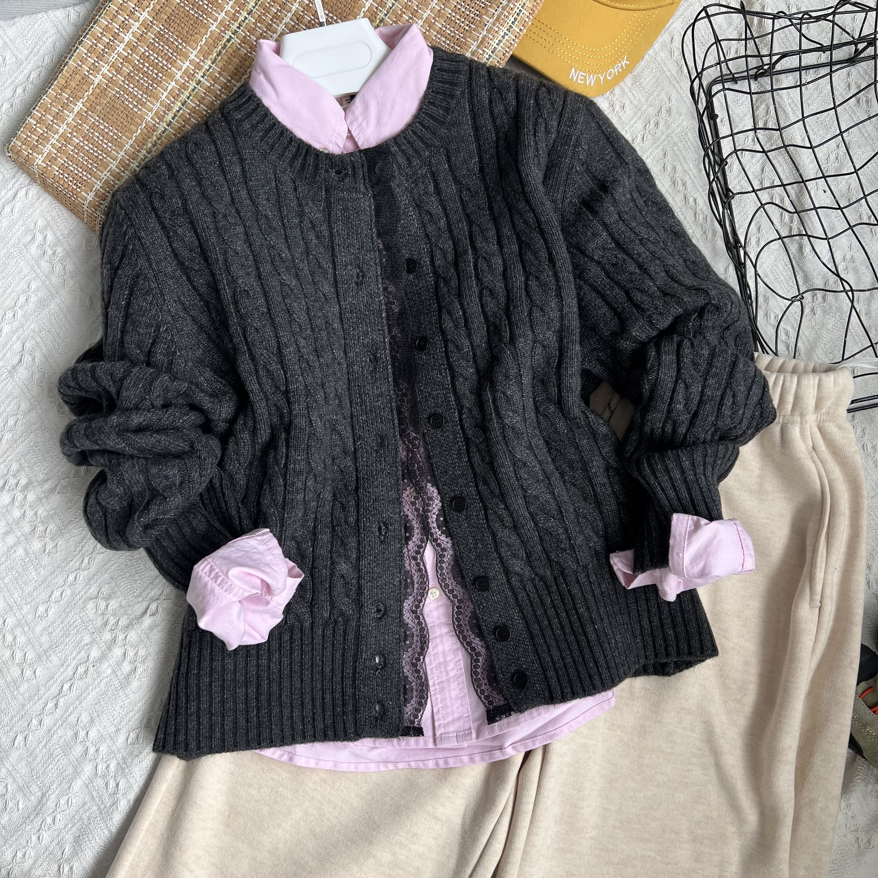 2025新款百搭简约麻花纹纯色圆领羊毛针织开衫