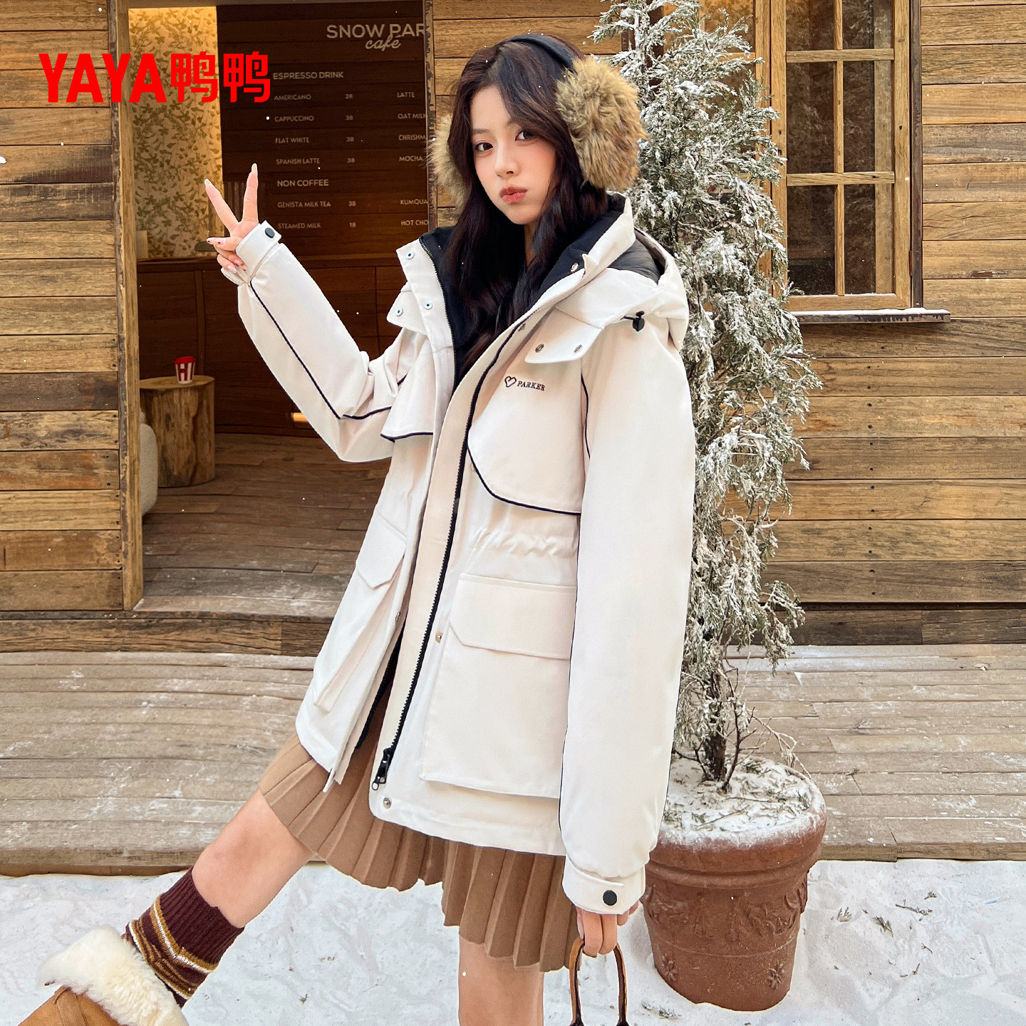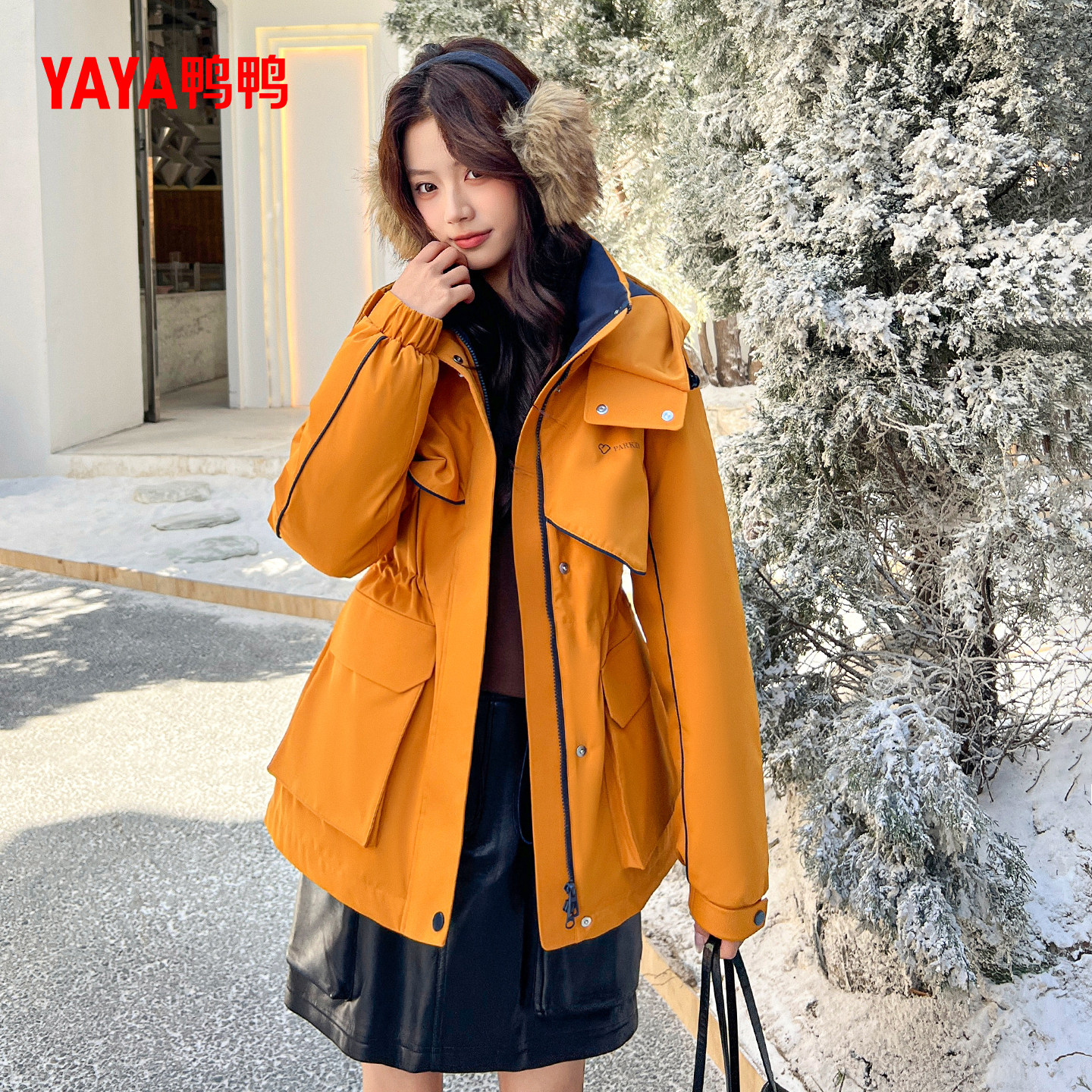 鸭鸭收腰羽绒服女2025秋冬新品中长款立领连帽休闲90鸭绒外套J