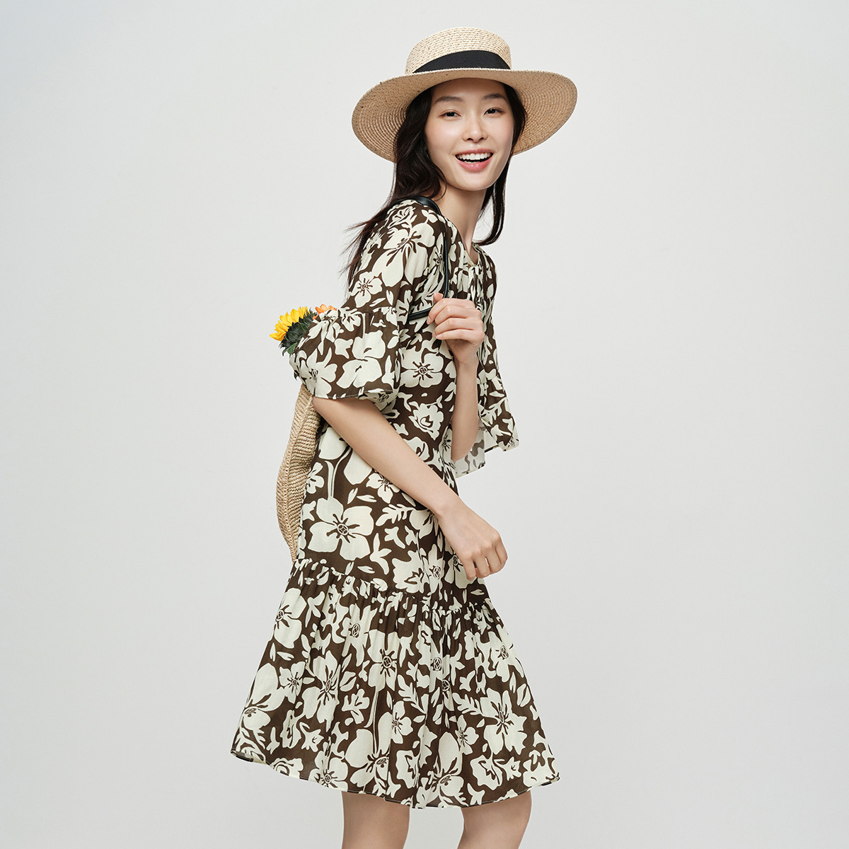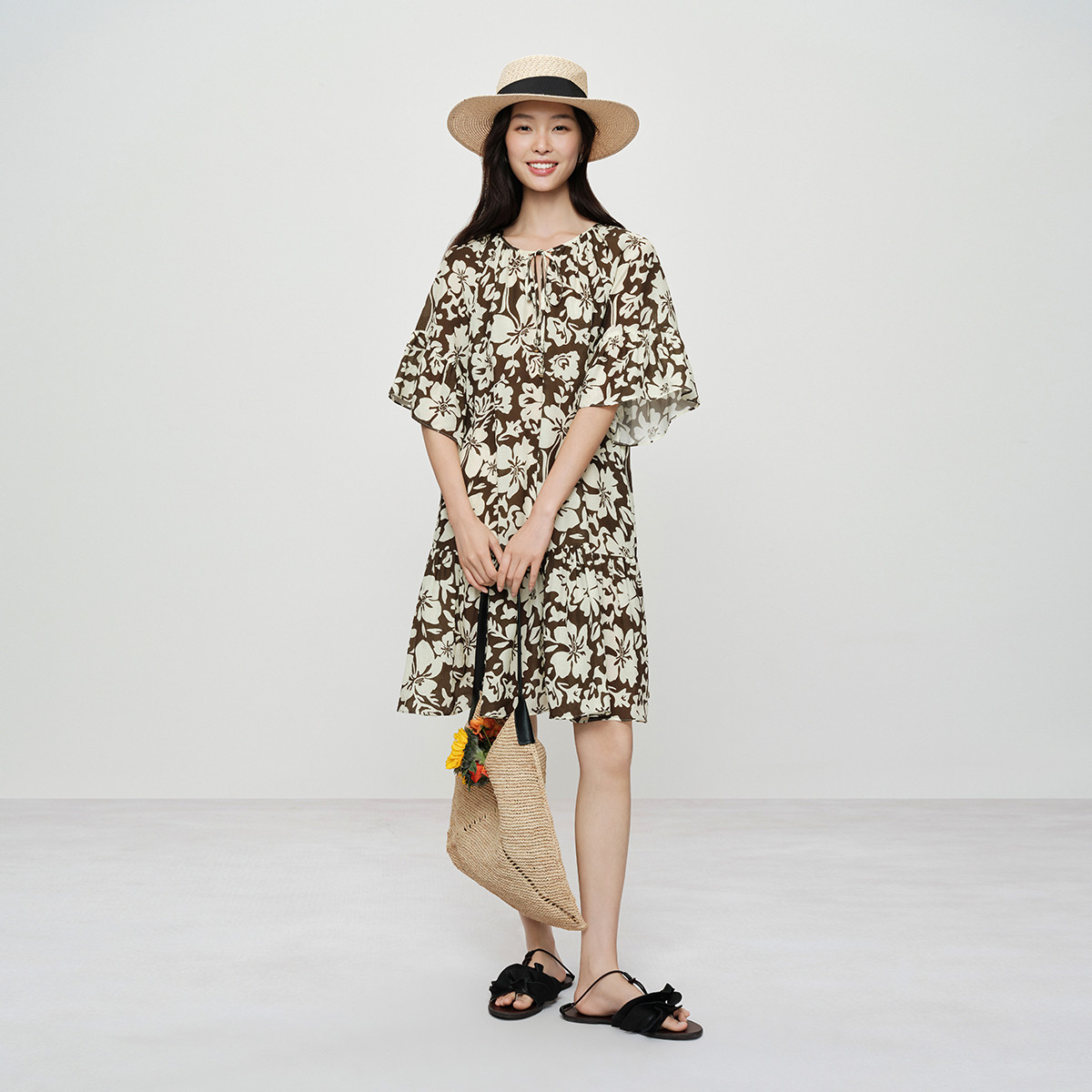 【抱花富印花】纳薇26夏新款亚麻莱赛尔法式度假风系带连衣裙
