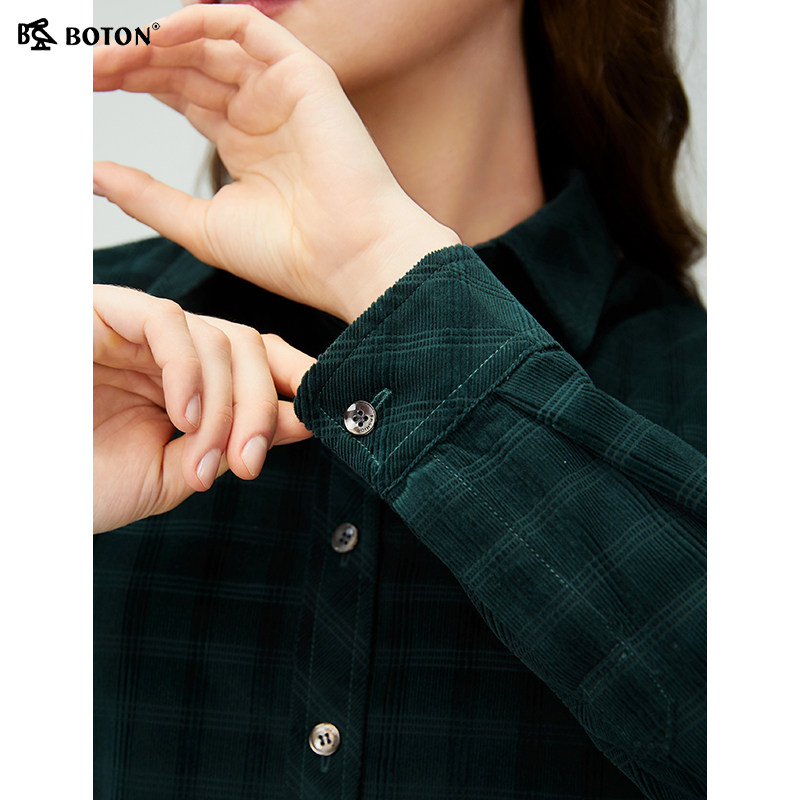 波顿秋冬新款翻领灯芯绒衬衫女长袖磨毛格子全棉修身衬衣通勤休闲