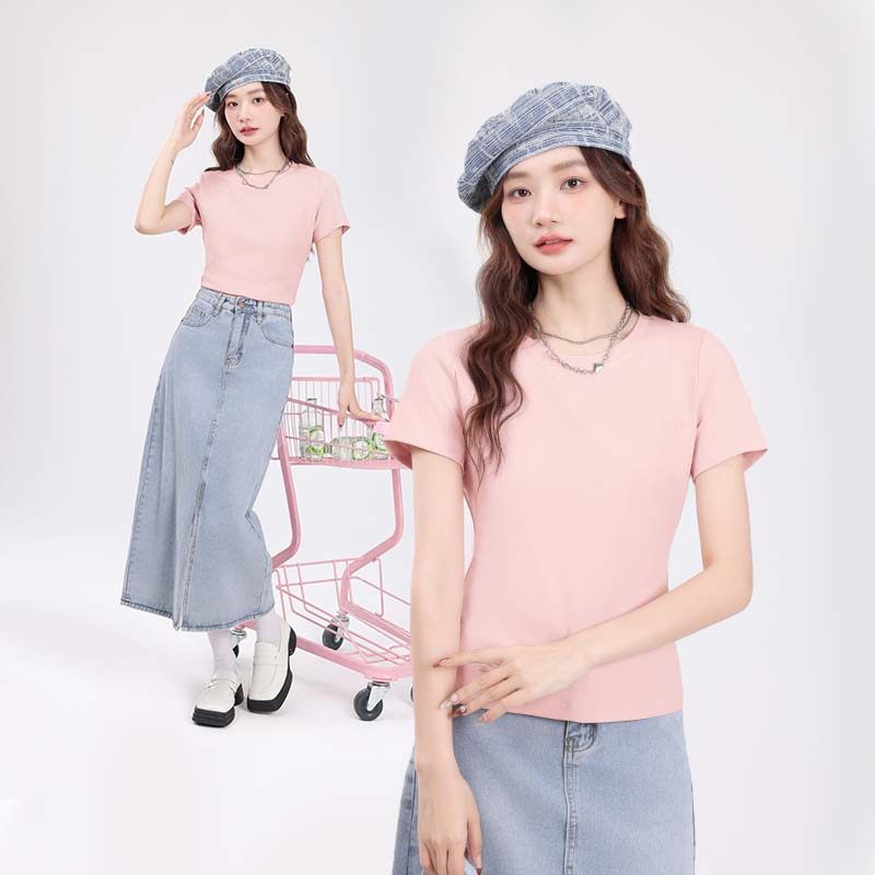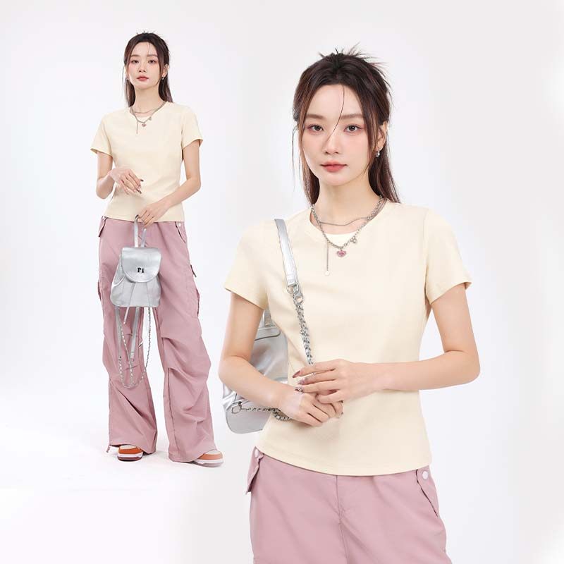KMV真维斯黑色短袖t恤女2025夏季新款圆领紧身半袖小个子短款上衣