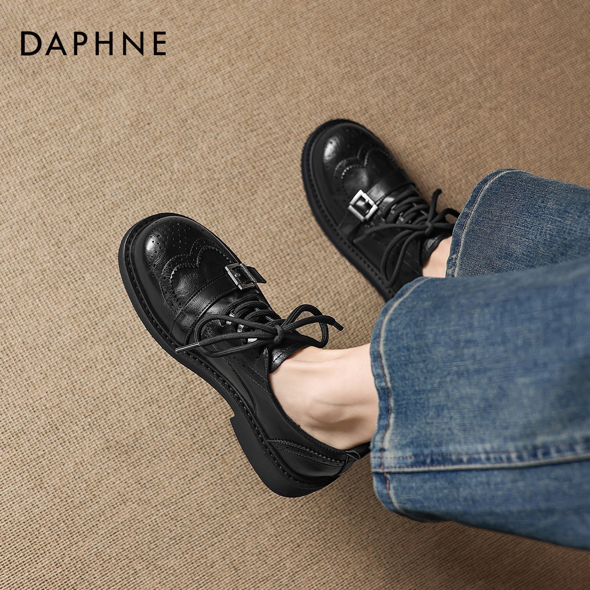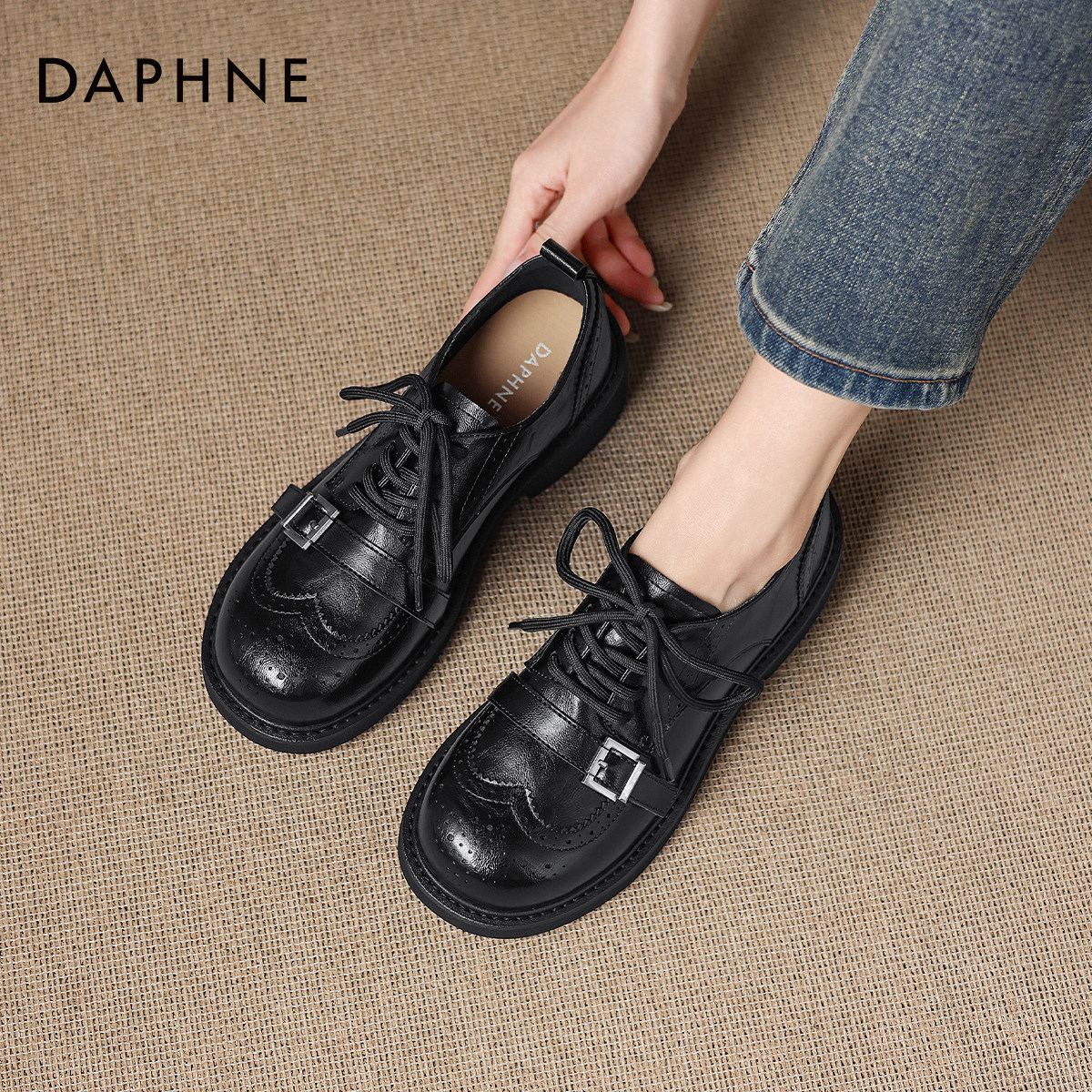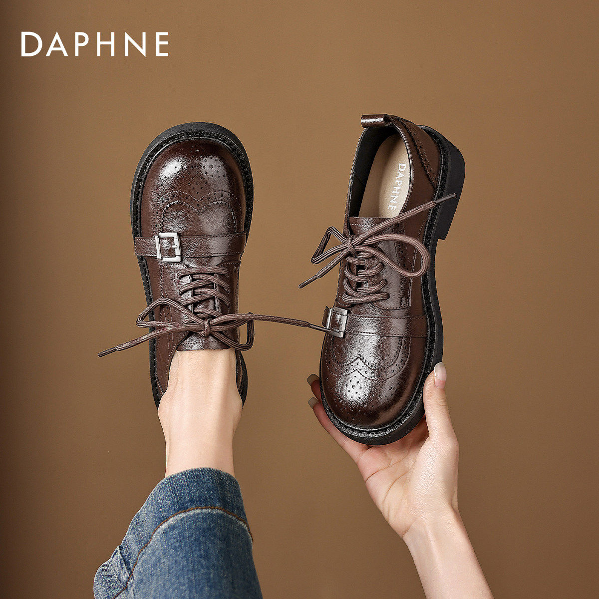 达芙妮英伦风小皮鞋2026新款春季布洛克系带乐福鞋棕色深口女鞋子