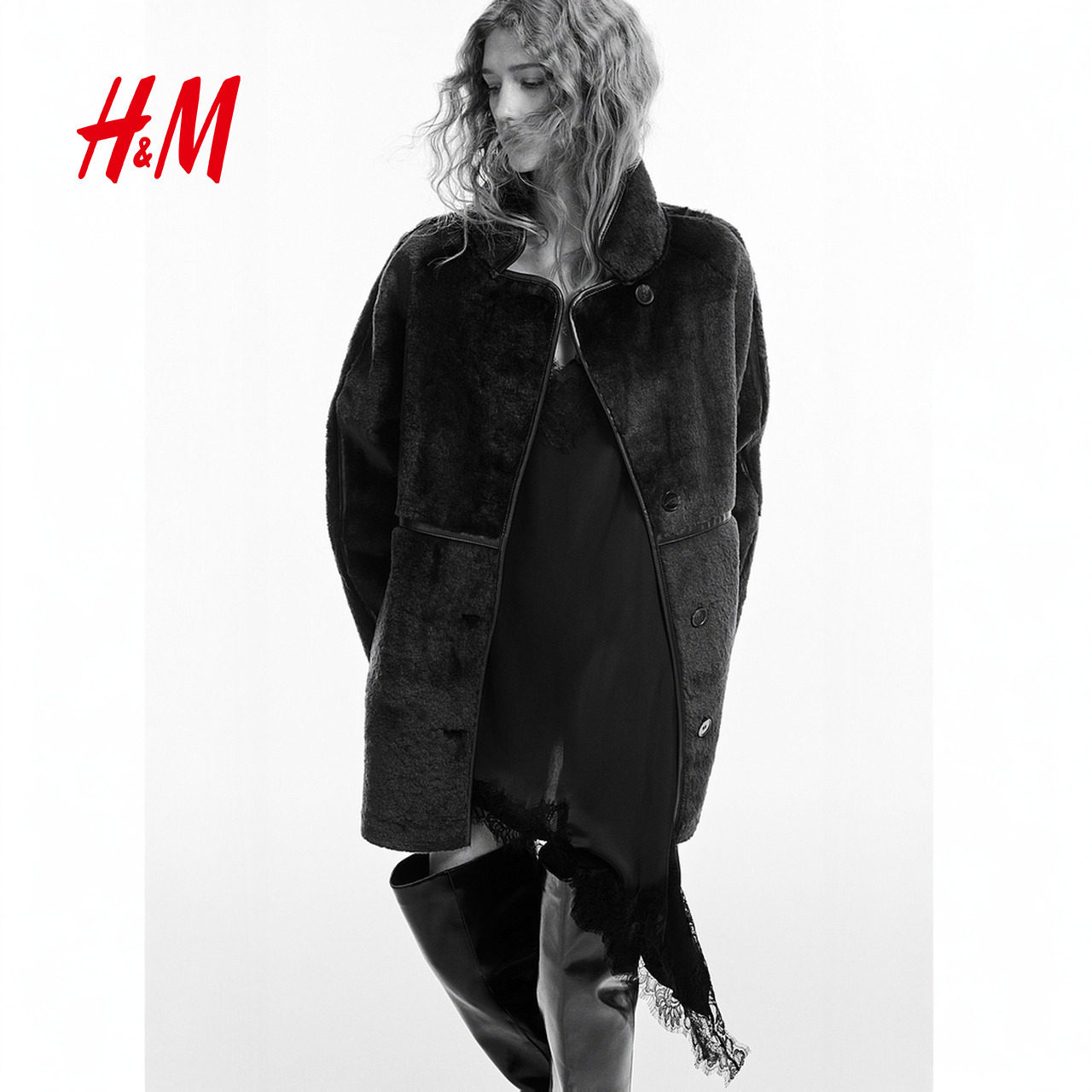 HM女装仿皮草冬季加绒加厚保暖中长款毛茸大衣外套1284946