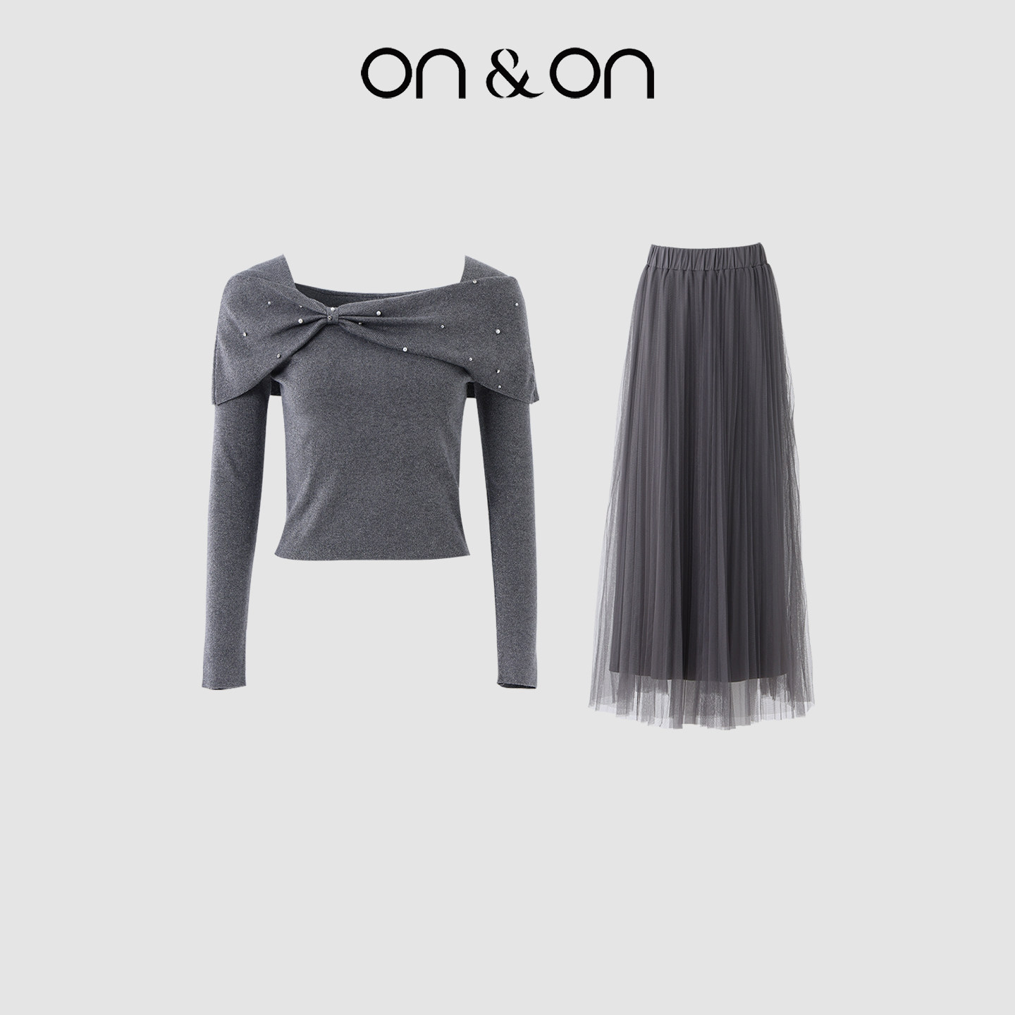 ON&ON/安乃安2026春季新款法式钉珠修身针织小衫+压褶网纱裙套装