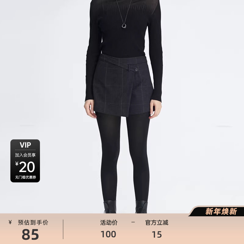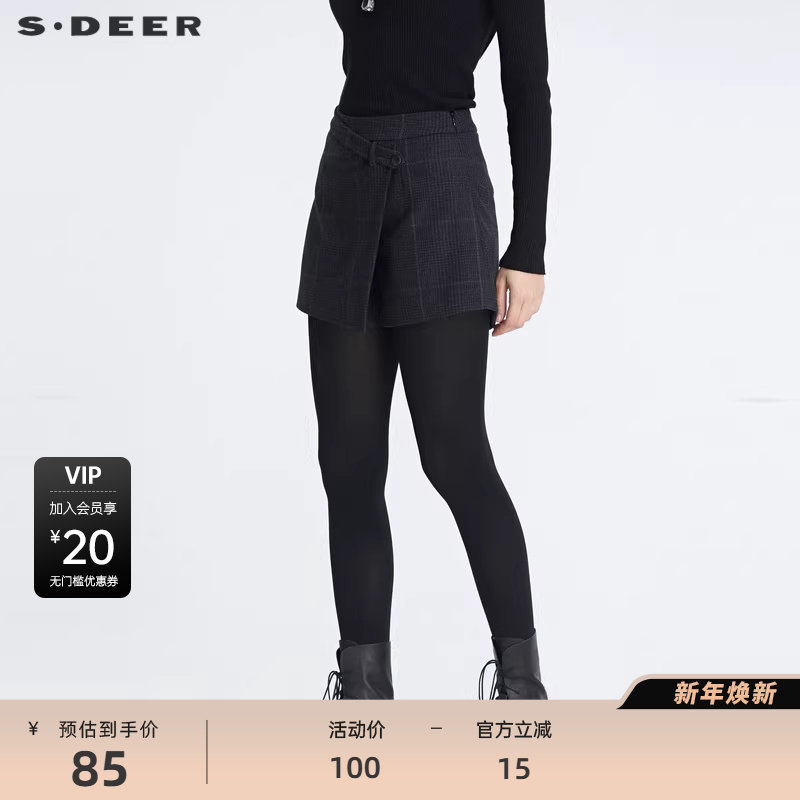 sdeer圣迪奥女装复古格纹搭片拼接毛呢短裤季裤子女S20480909