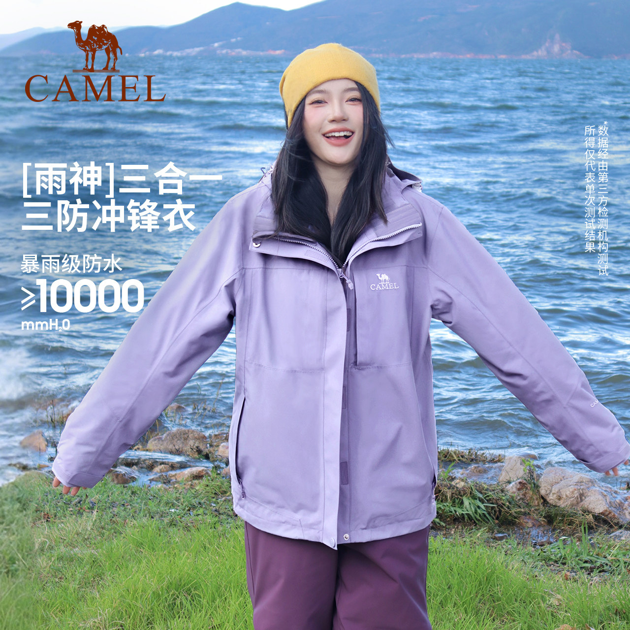 骆驼户外三防冲锋衣女三合一可拆卸防水外套男星云紫色旅游登山服