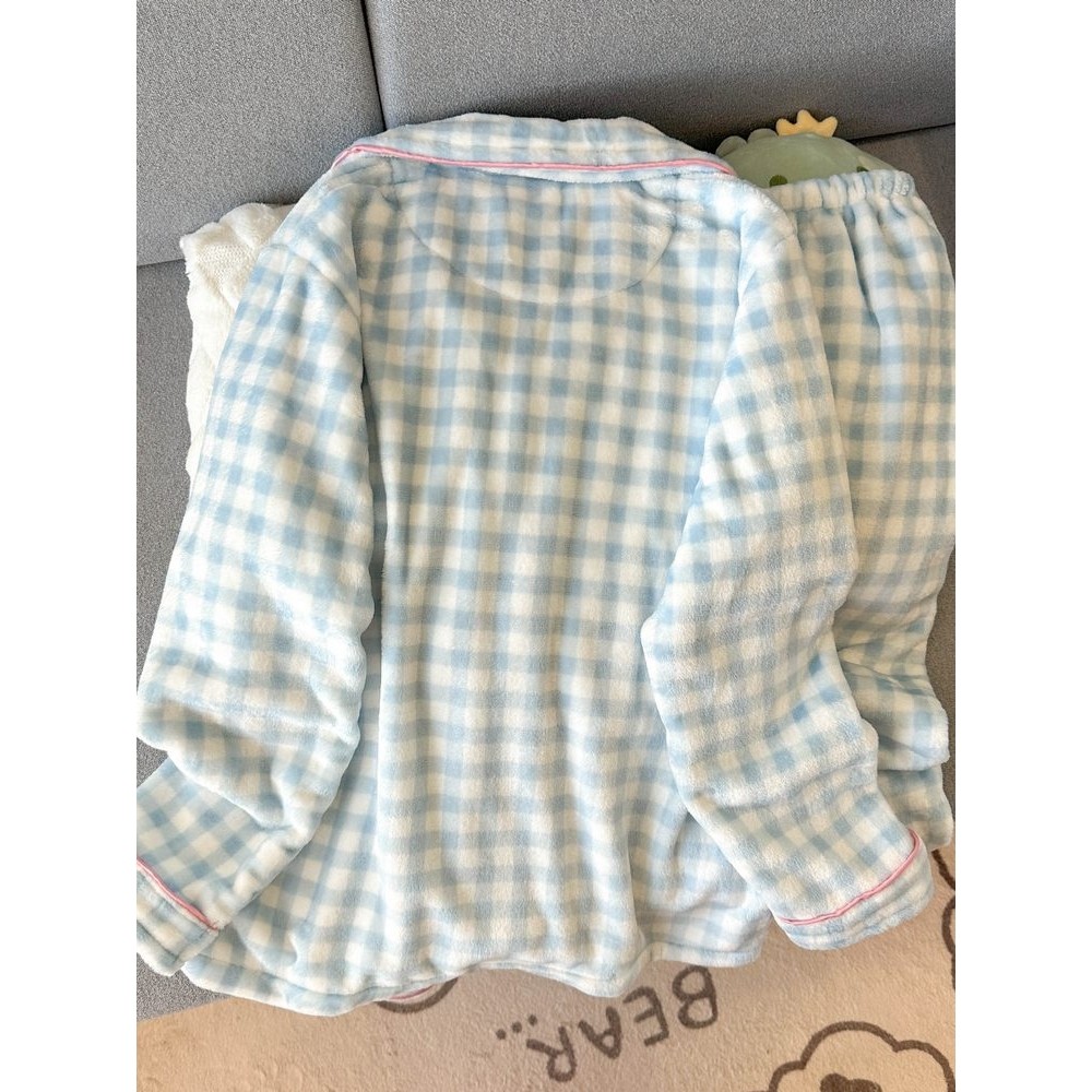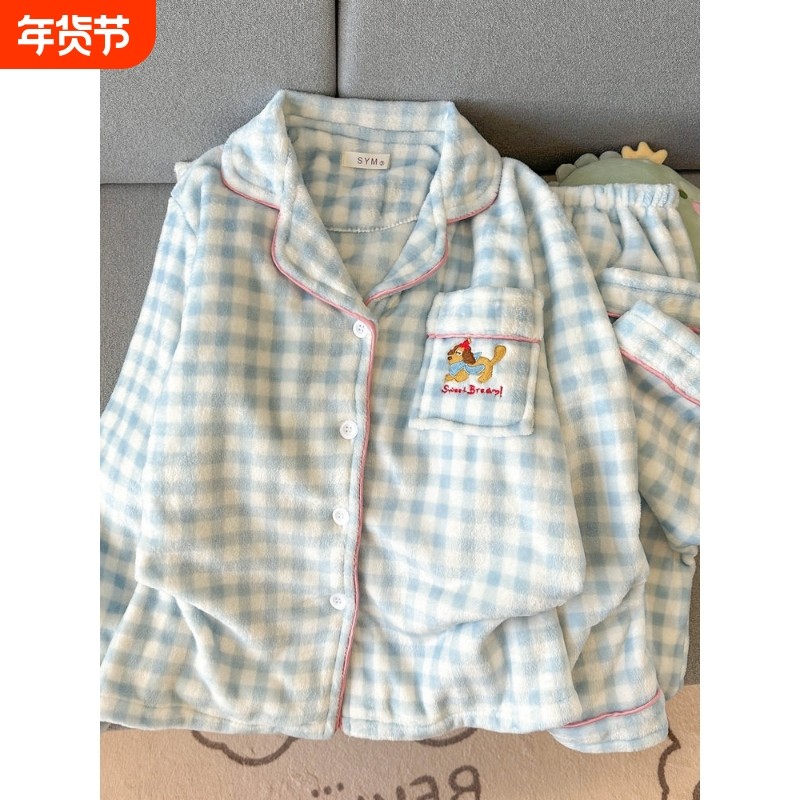红豆法兰绒日系刺绣腊肠狗大码睡衣女秋冬加厚加绒甜美蓝格保暖家