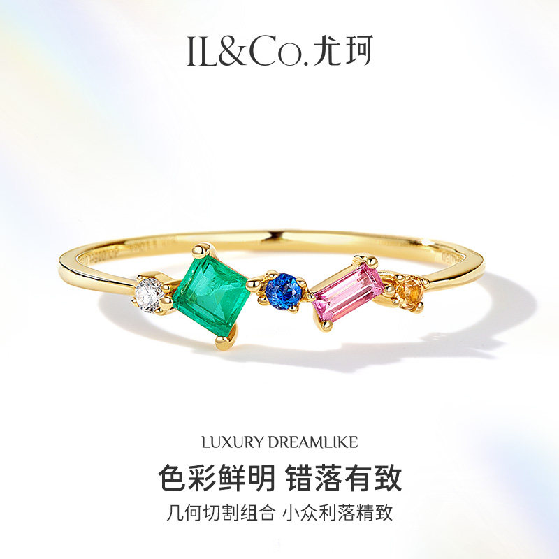 ILCO尤珂「绿野几何」天然祖母绿18K金排戒粉碧玺镶嵌彩宝细戒指