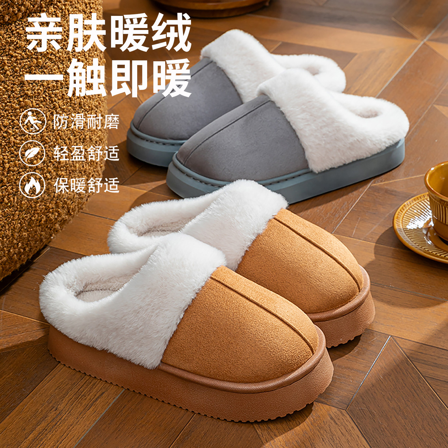 朴西棉拖鞋女士秋冬季厚底简约保暖室内居家用软底防滑情侣棉拖男