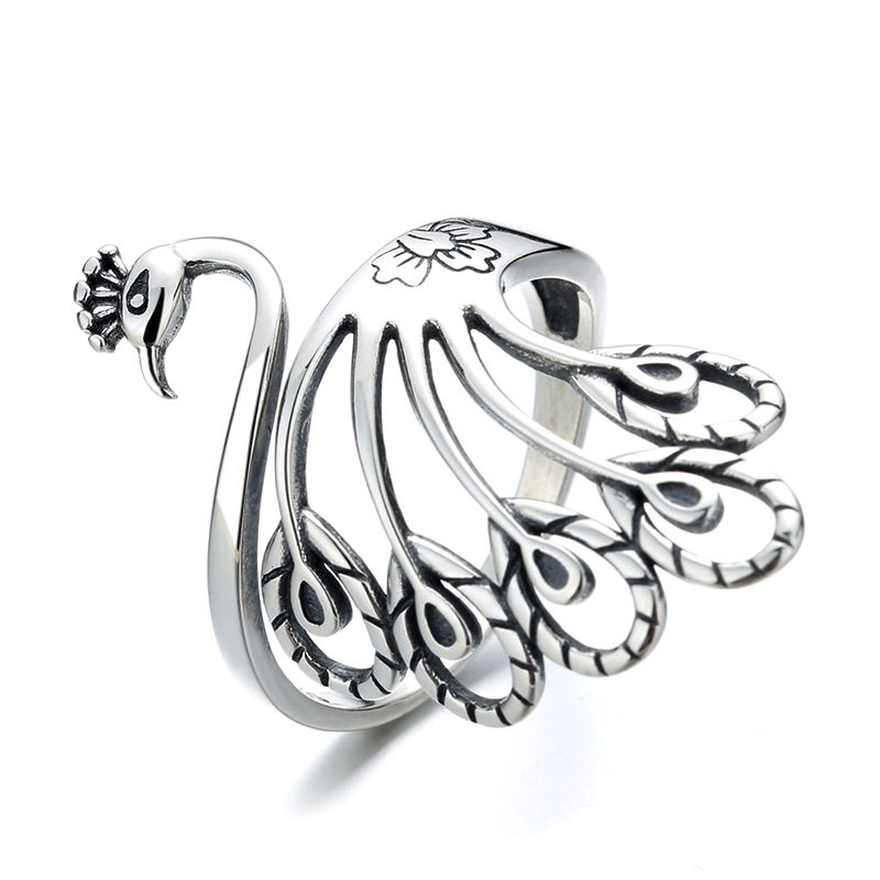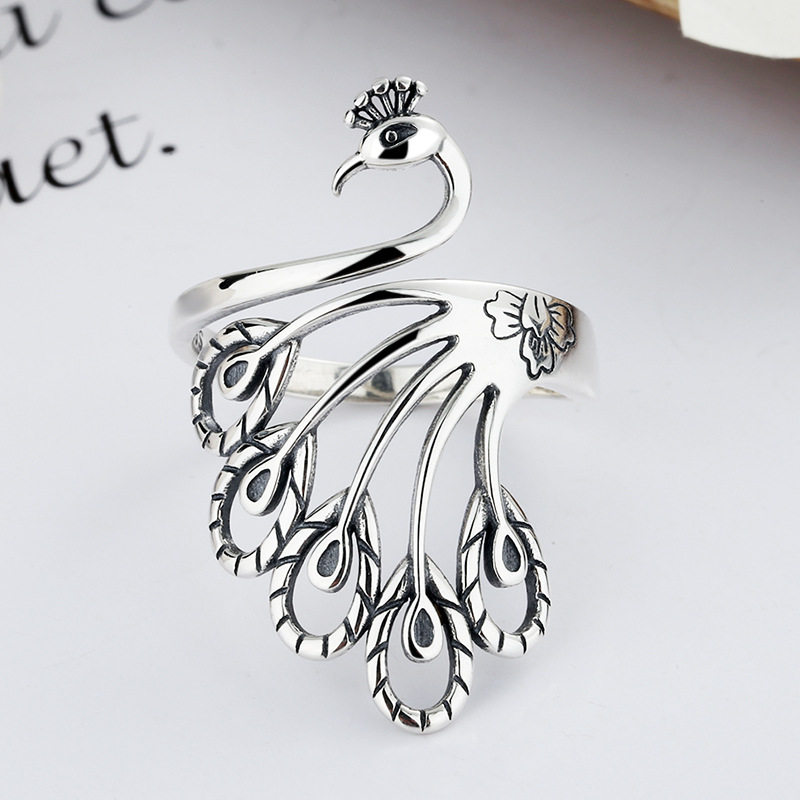 创意复古活口孔雀S925纯银宽面戒指女民族风泰银凤凰做旧戒指环
