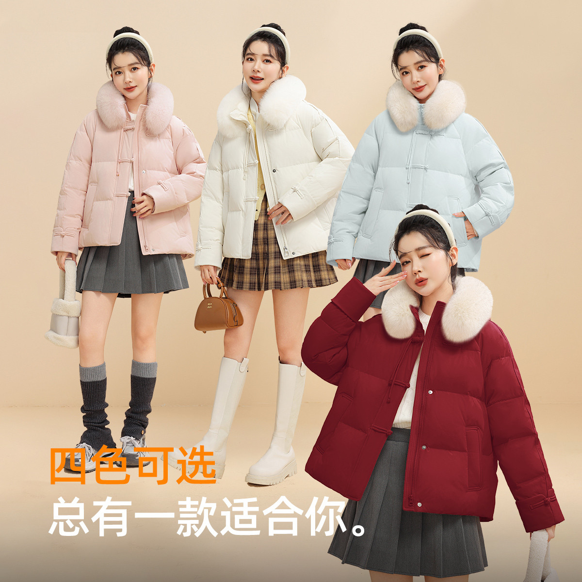 雪中飞2025冬新女短新年红羽绒服狐狸毛领新中式甜美纯色保暖外套