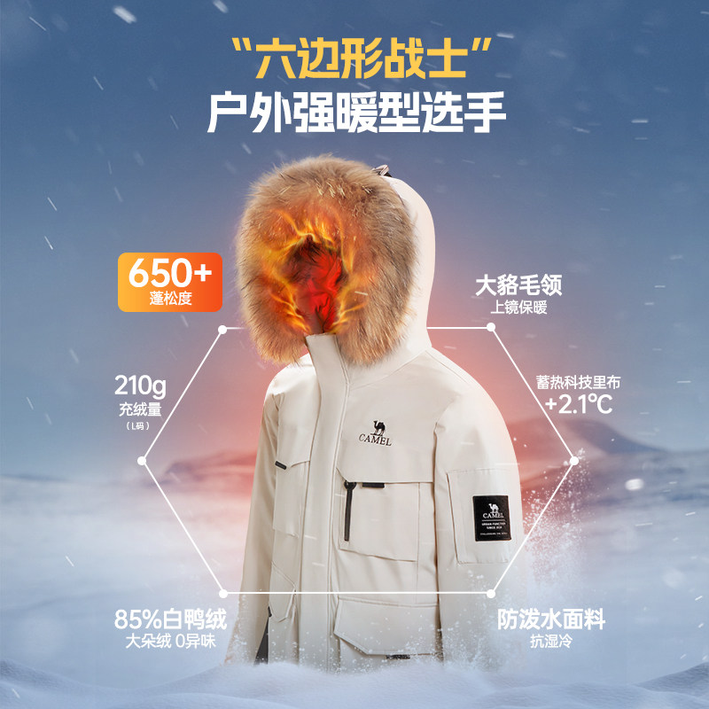 骆驼火焰羽绒服男冬季2025新款大毛领极寒工装派克服加厚保暖外套