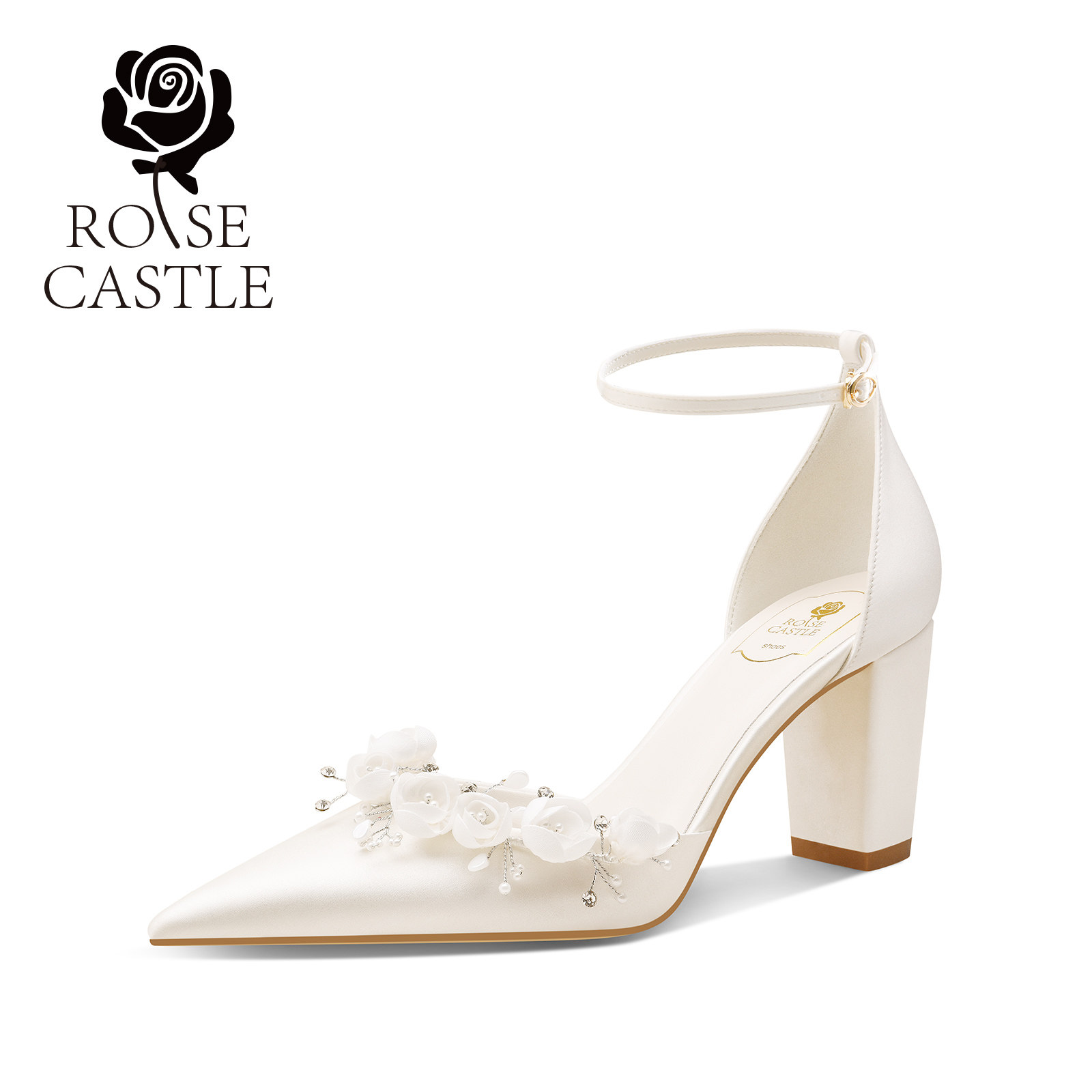 rosecastle花朵婚鞋女粗跟不累脚新娘鞋2025夏季一字带高跟凉鞋女