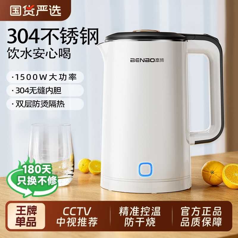 本博电热水壶家用不锈钢保温一体烧水壶自动断电大容量开水壶双层