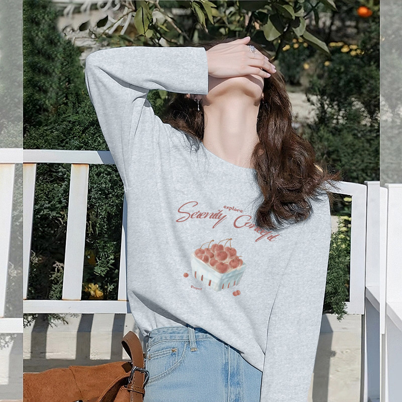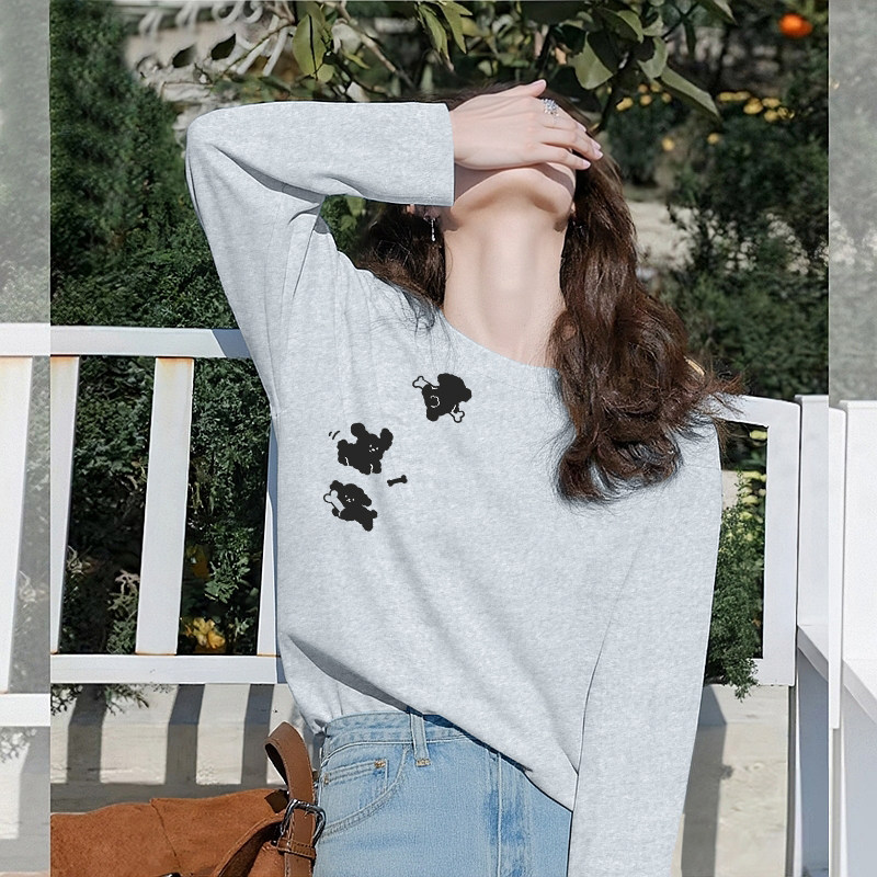 KHV真维斯灰色纯棉长袖t恤女2025秋季新款独特猫咪印花打底衫上衣