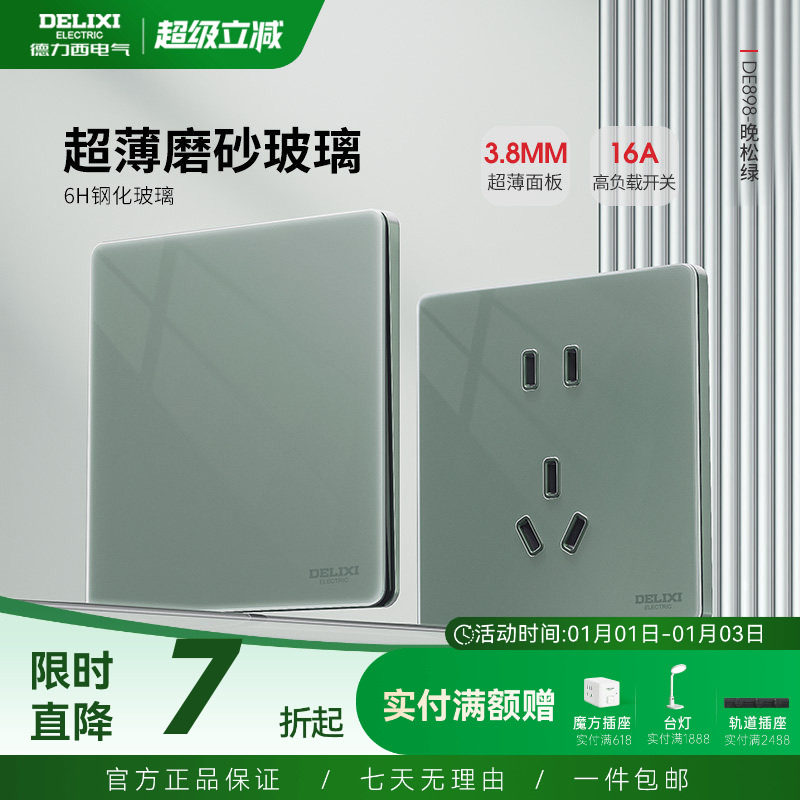 德力西官方旗舰店开关插座面板五孔家用墙开超薄玻璃磨砂898绿色