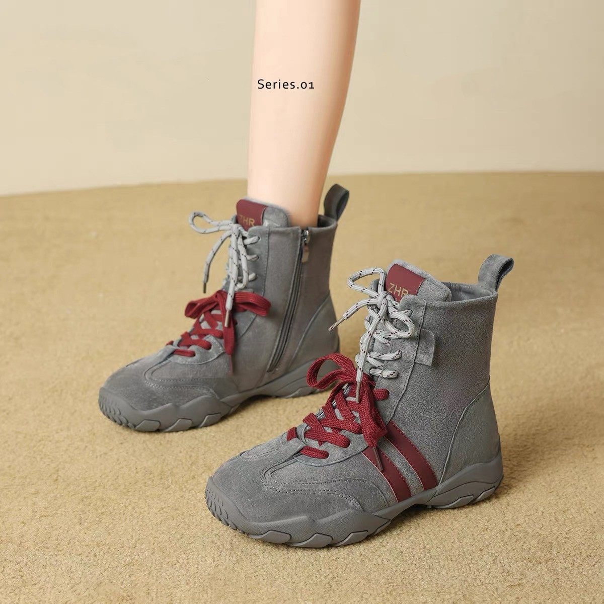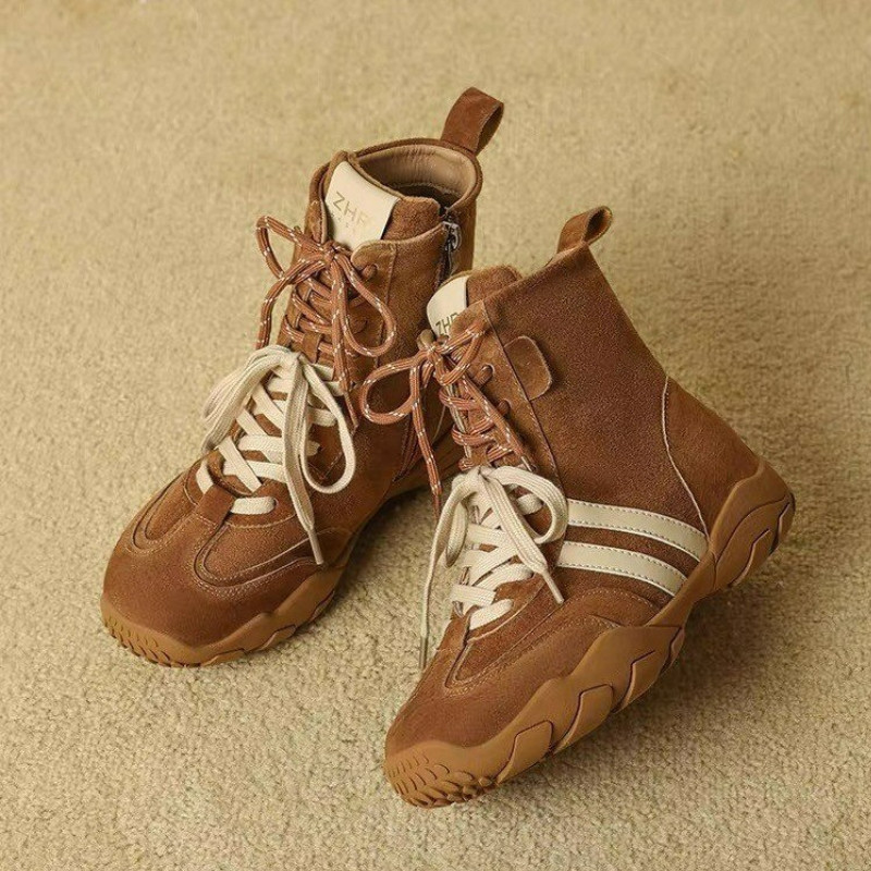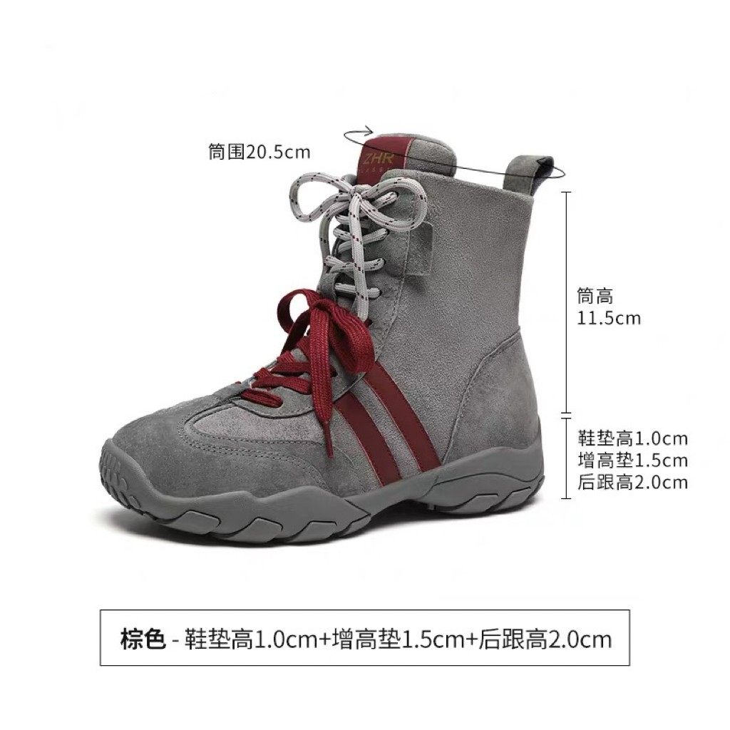 真皮短靴女马丁靴2025新款秋冬季内增高拳击靴厚底高帮德训鞋灰色