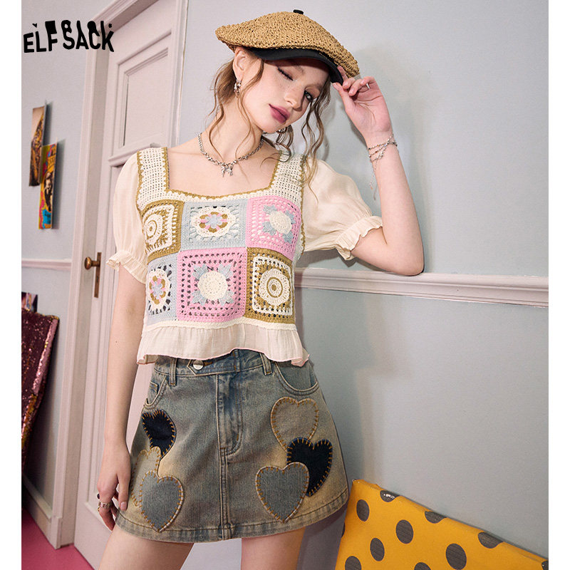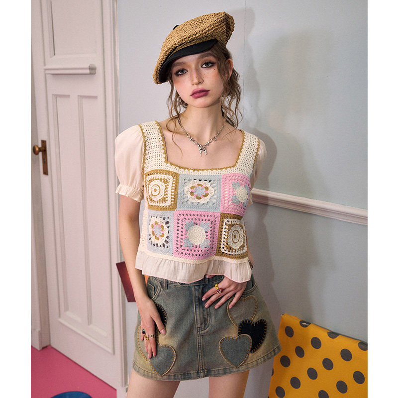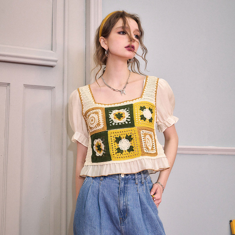 妖精的口袋雪纺拼接方领钩花针织衫女2025春夏新款泡泡袖短款上衣