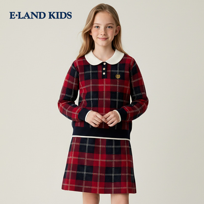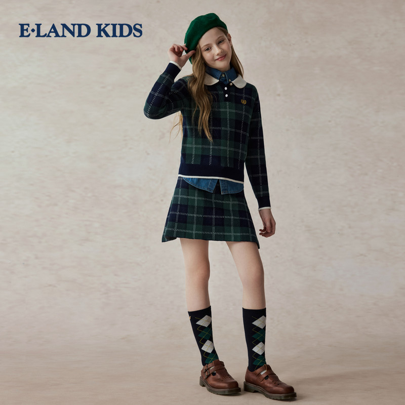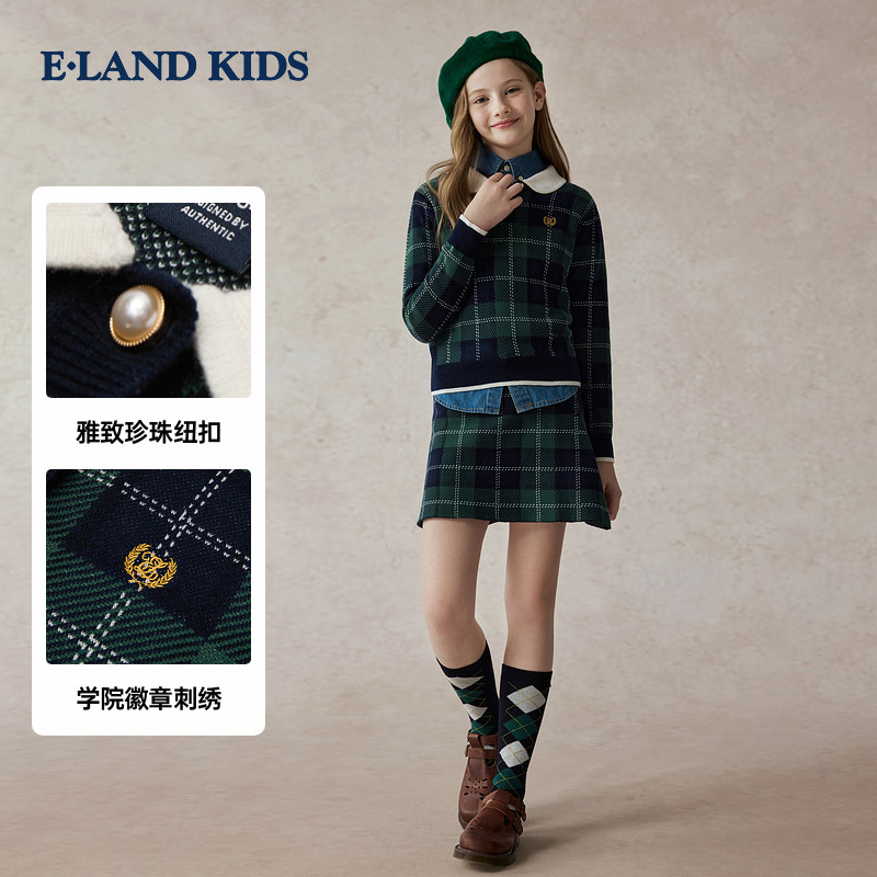 【100%棉】eland kids衣恋童装女童针织套装25年秋冬格子毛衣裙子