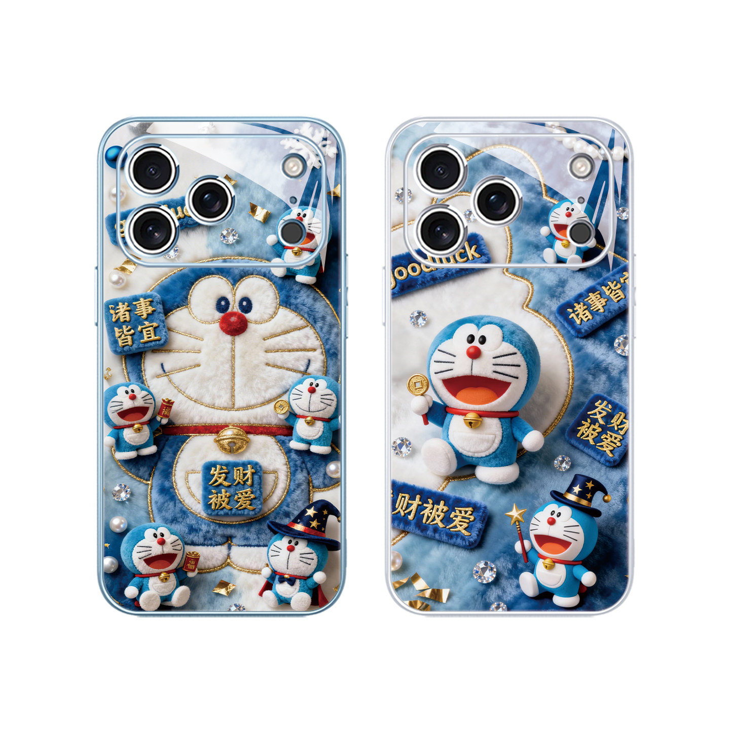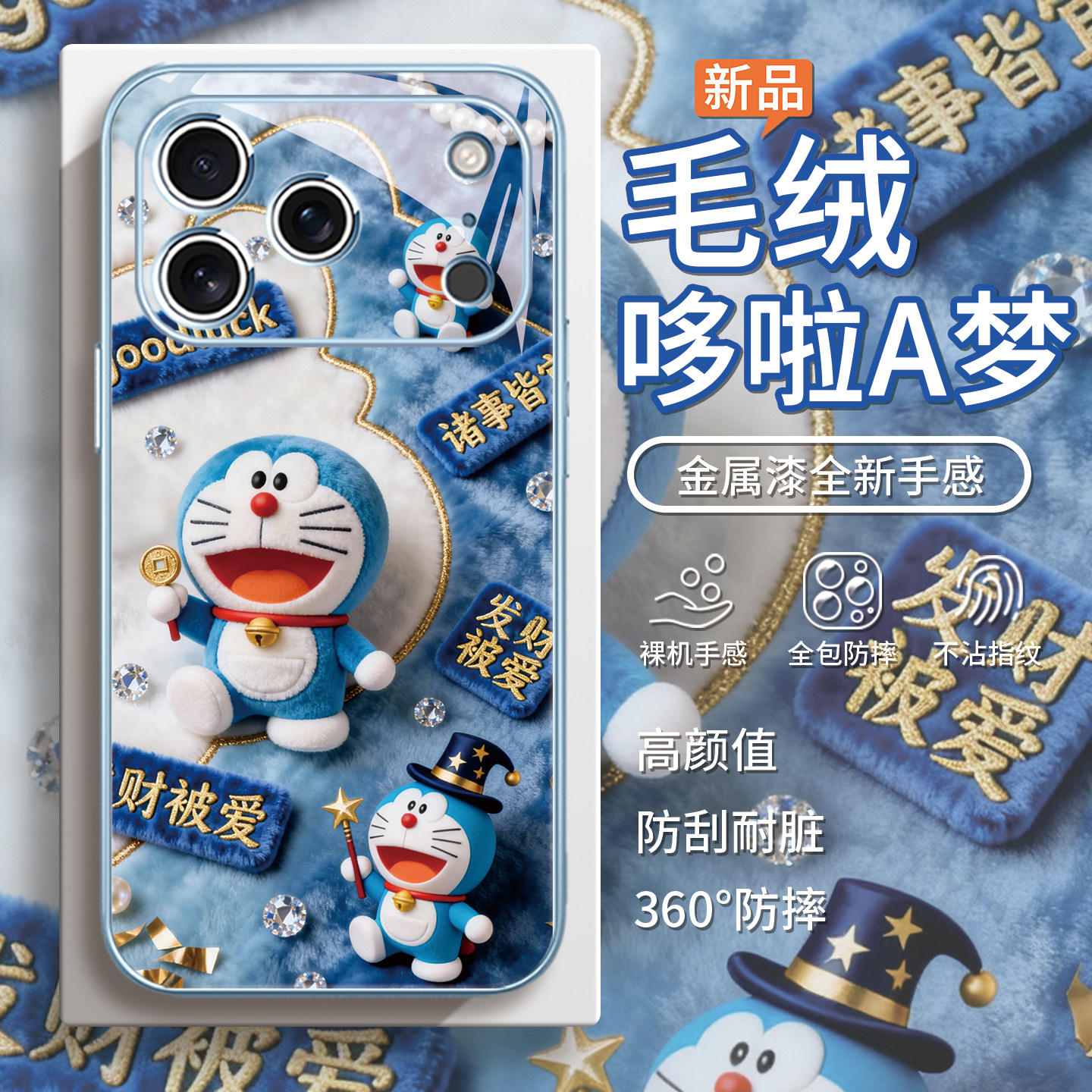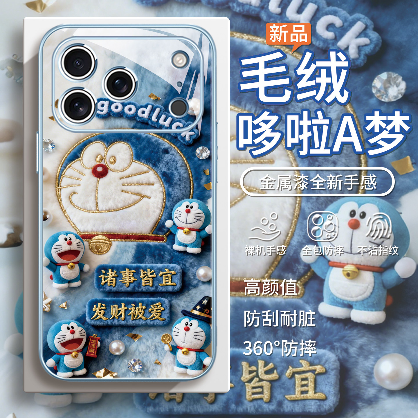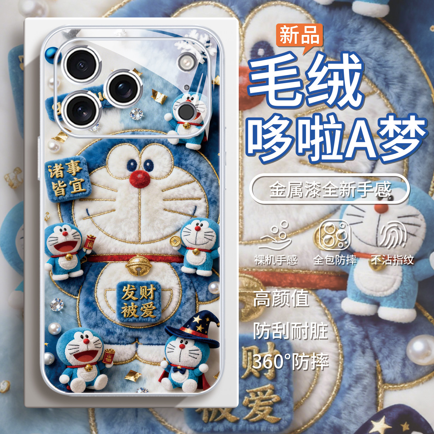 适用毛绒iPhone17手机壳哆啦A梦苹果16秋冬15prom毛茸茸14小叮当13招财air吸引力12法则11冬天plus诸事皆宜xs