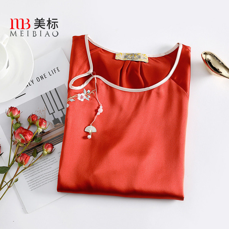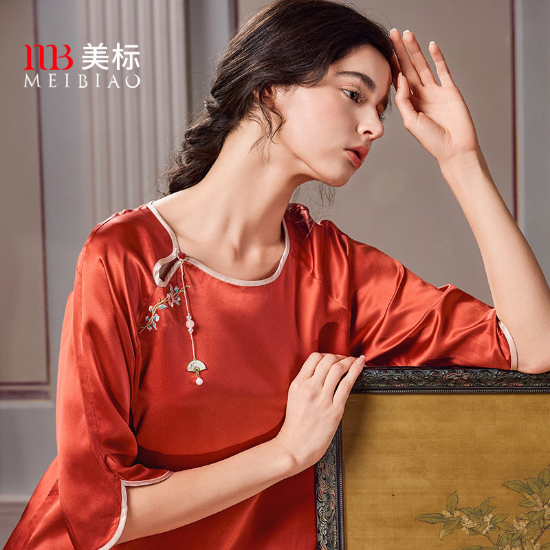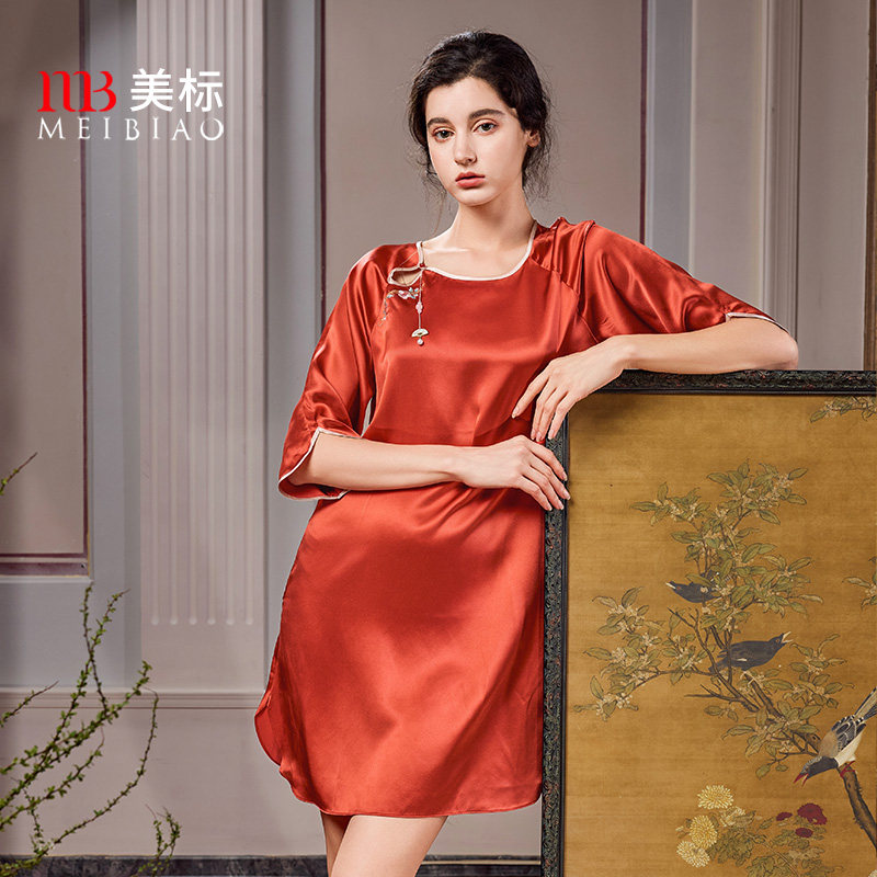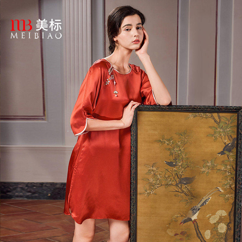 美标春夏重磅桑蚕丝七分袖睡裙女中国风红色本命年家居服丝绸睡衣