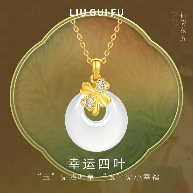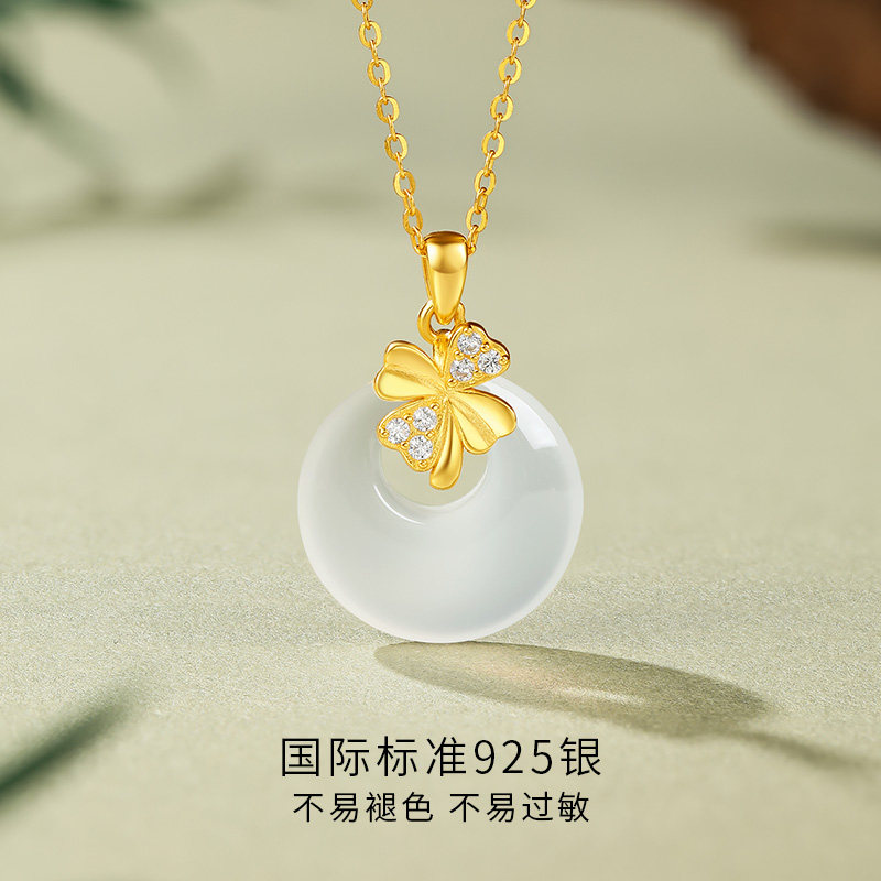 六桂福珠宝S925银平安扣吊坠镶嵌四叶草玉髓项链情人节新年礼物