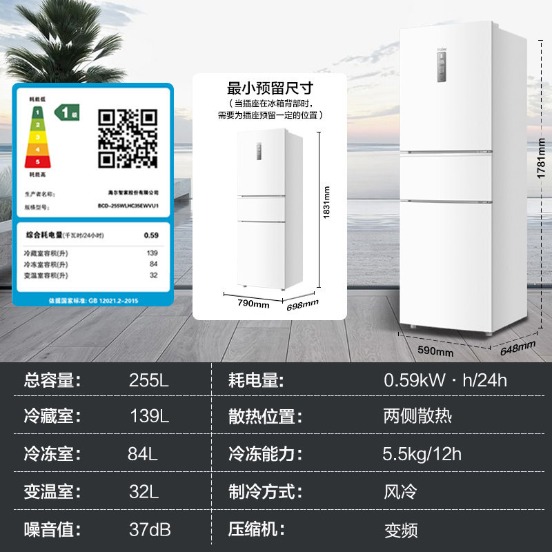 政府以旧换新补贴海尔255L三开门家用小型电冰箱风冷一级能效出租