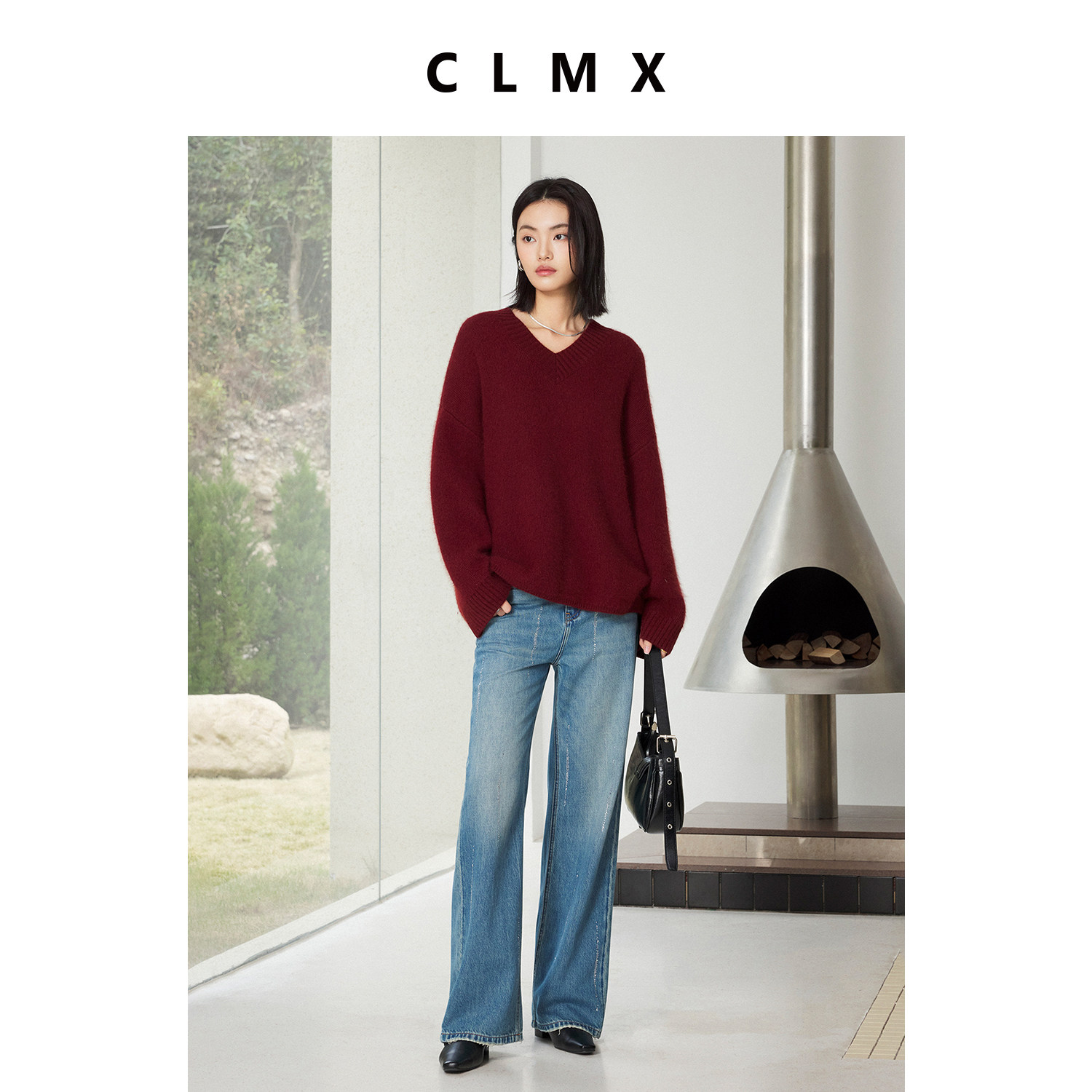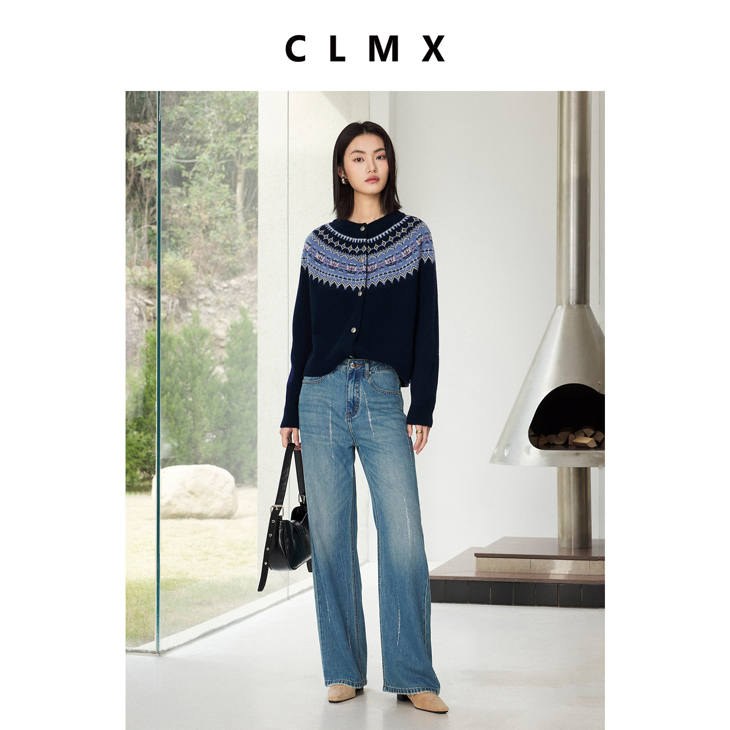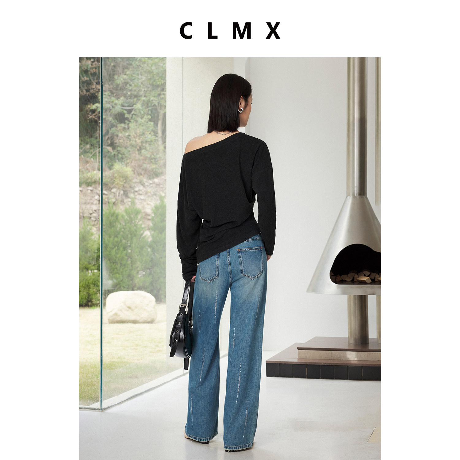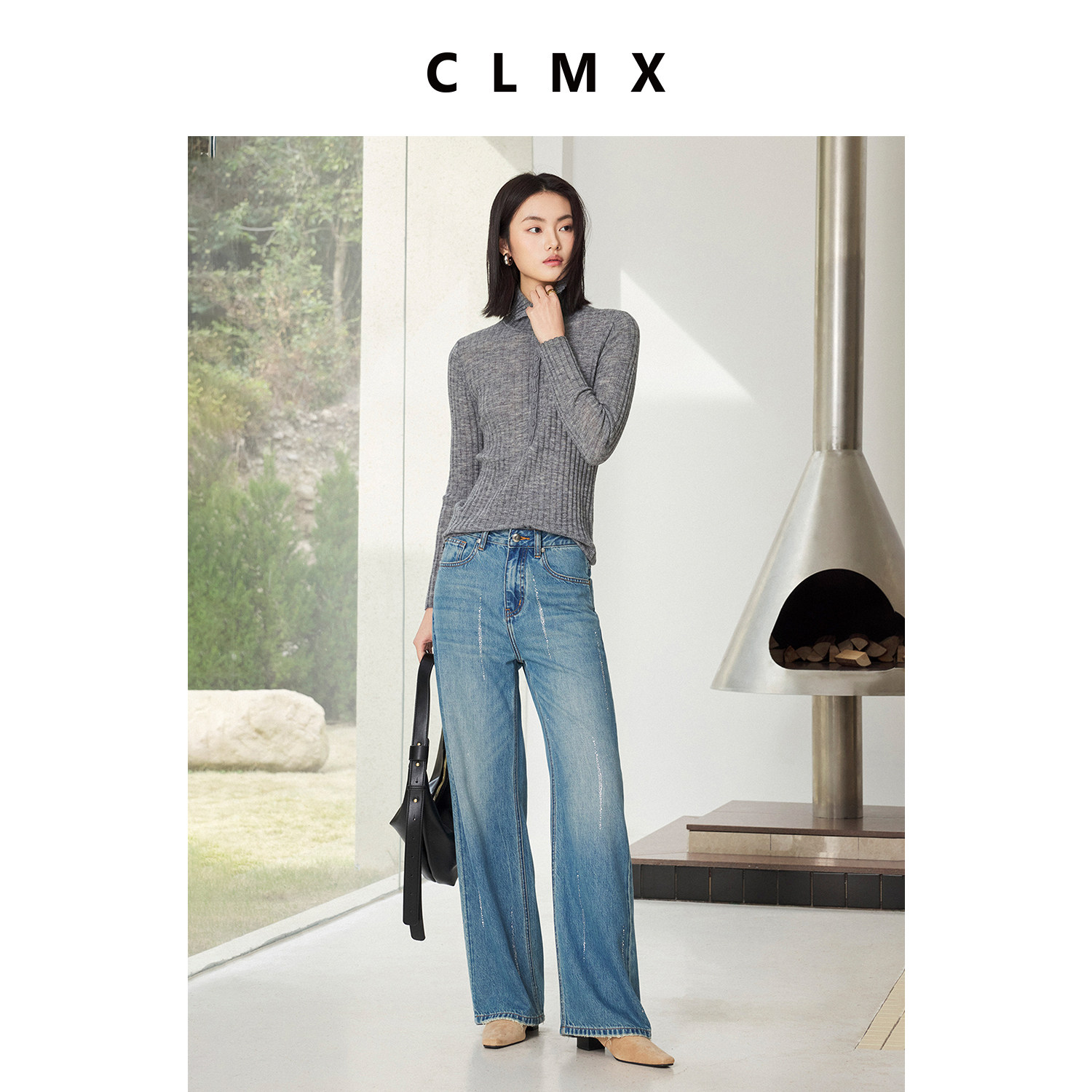 CLMX棉莱赛尔亚麻混纺斜纹牛仔布直筒廓形宽松自在时髦烫钻牛仔裤