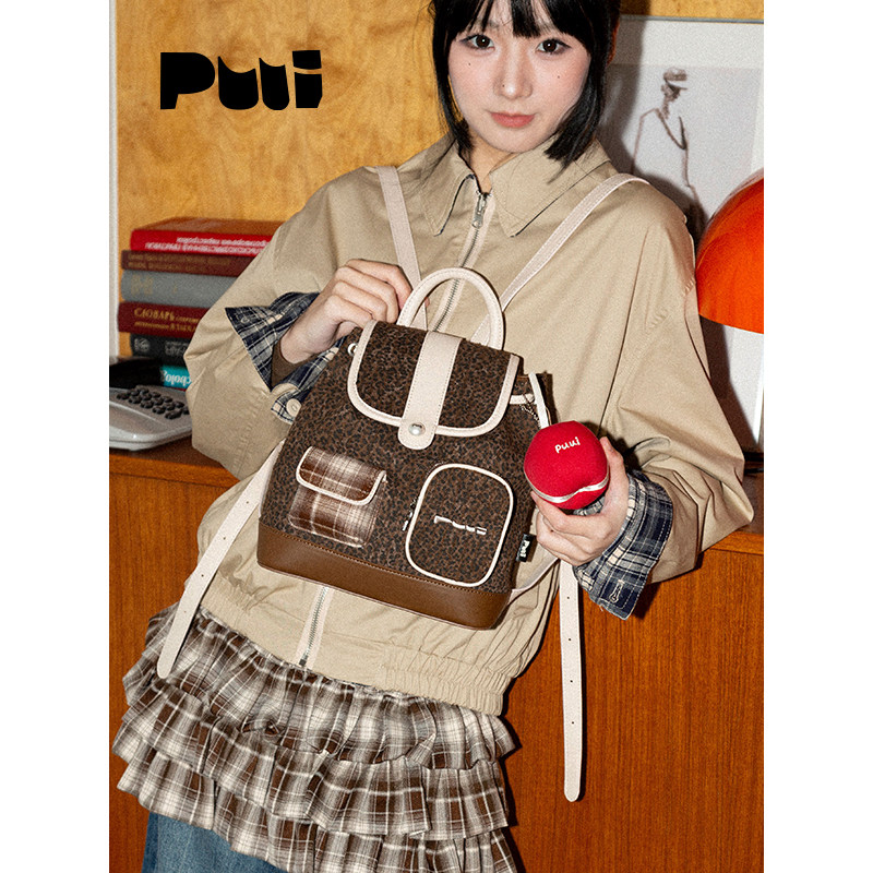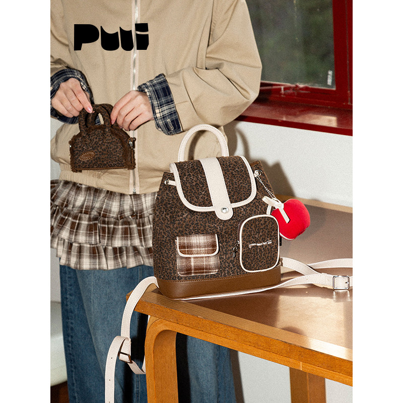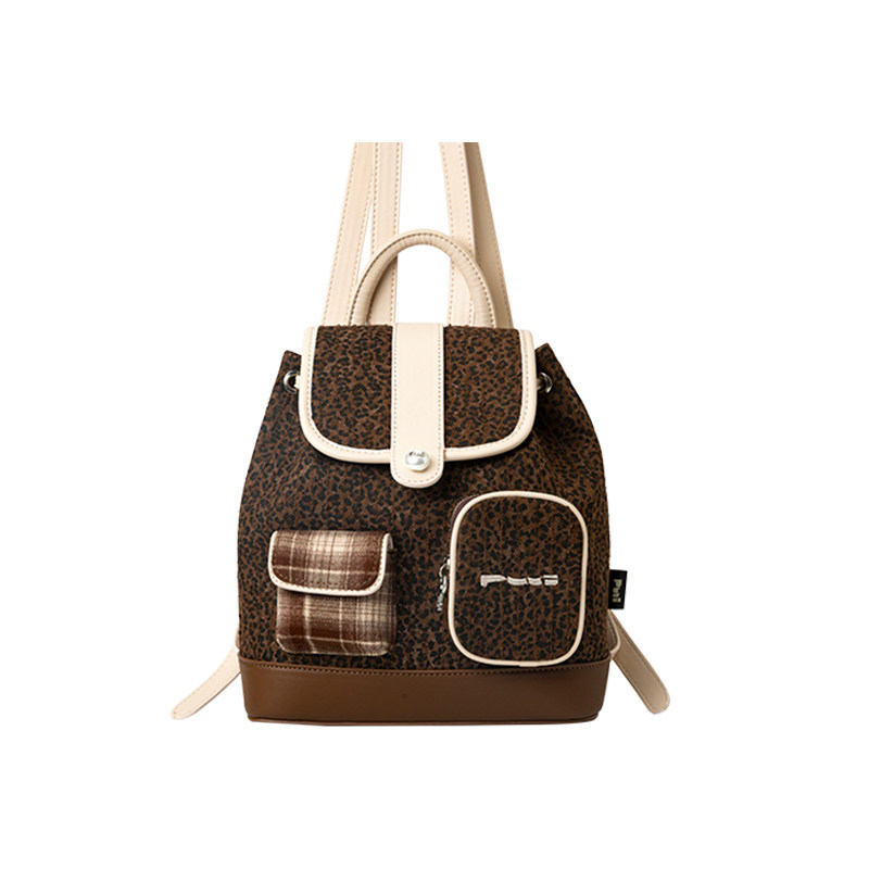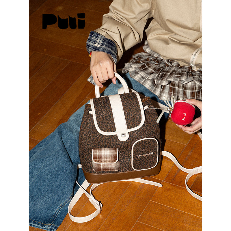 【明星同款】puui原创生活双肩包秋冬复古豹纹抽绳翻盖小背包ins