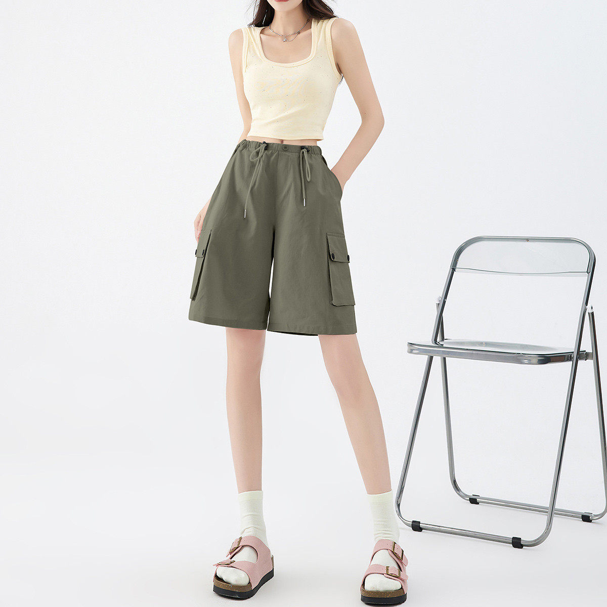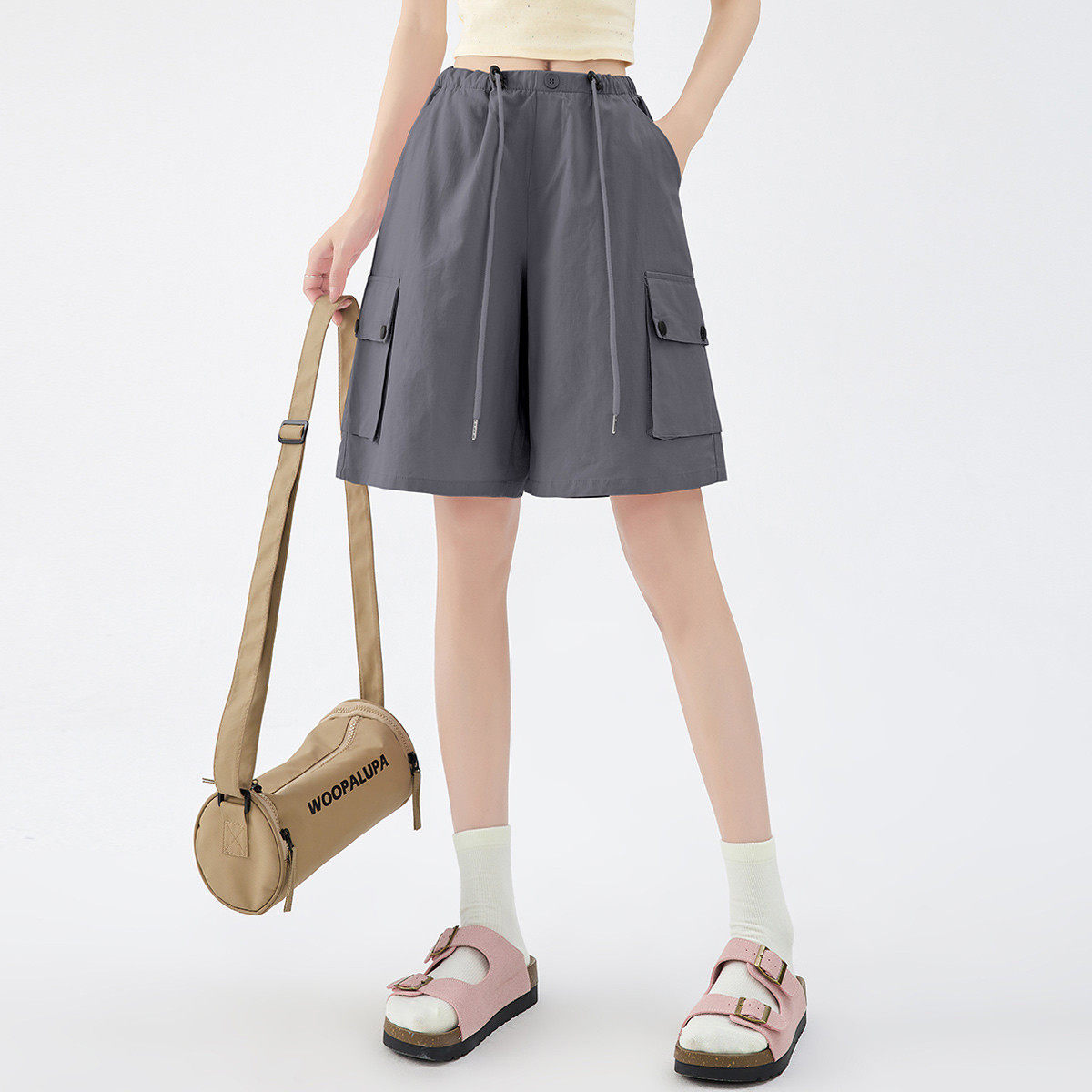 one more多巴胺穿搭2025夏季新款美式抽绳高腰百搭短裤抽绳工装裤