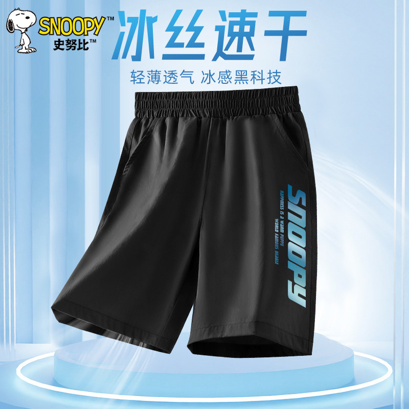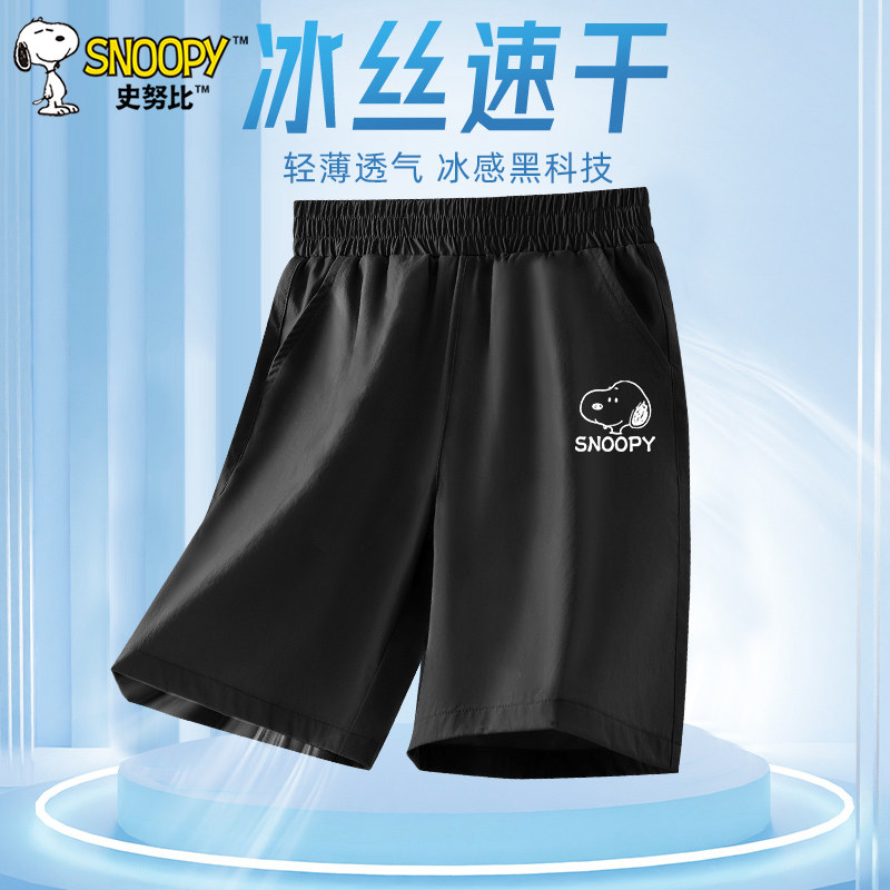 史努比男童夏季短裤男孩冰丝运动裤2025新款男大童速干五分裤子黑