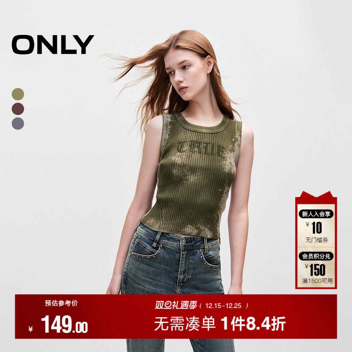 ONLY冬季复古字母做旧螺纹无袖短款针织衫女|124324017