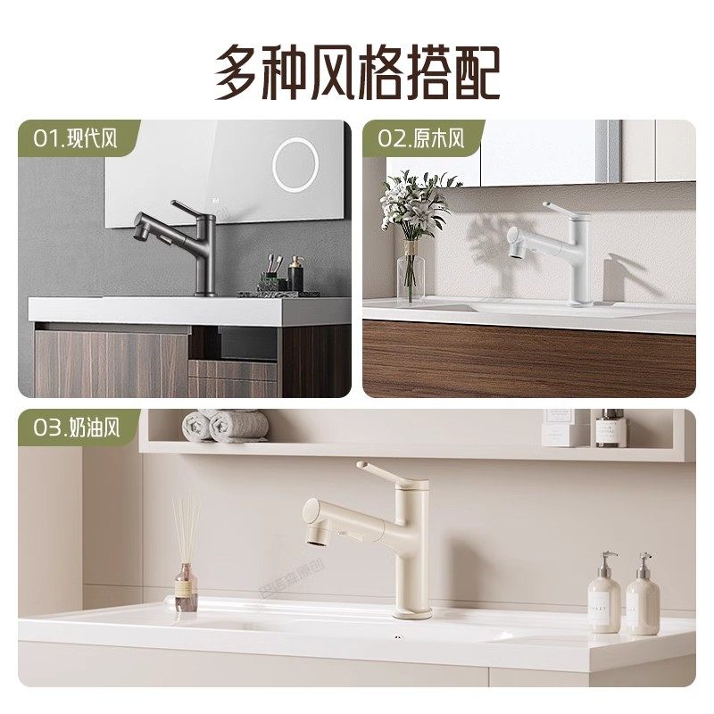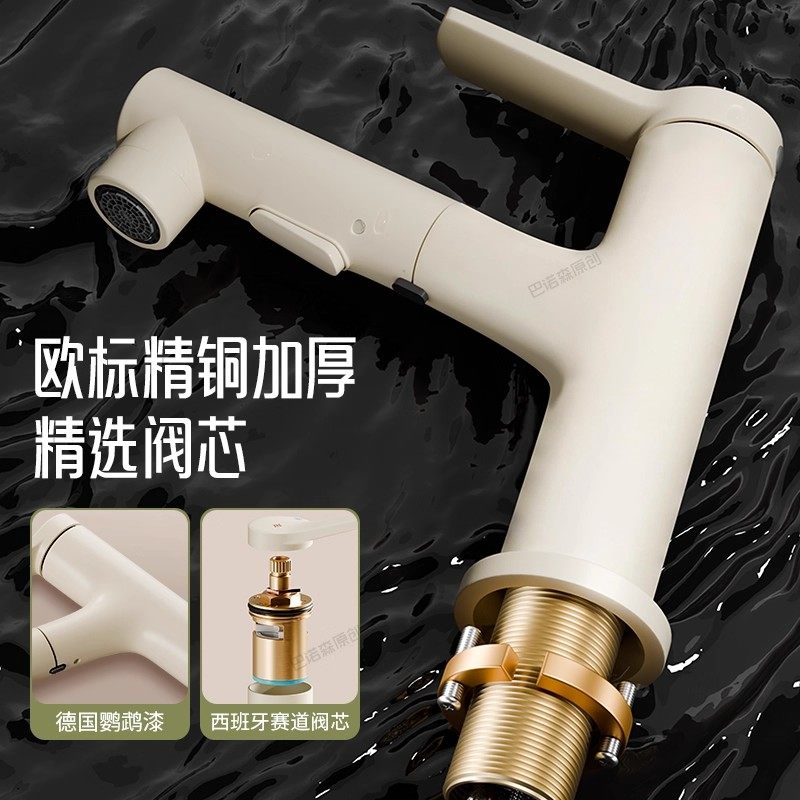 奶油风精铜白色洗手盆水龙头家用洗脸盆抽拉式卫生间面盆台盆冷热