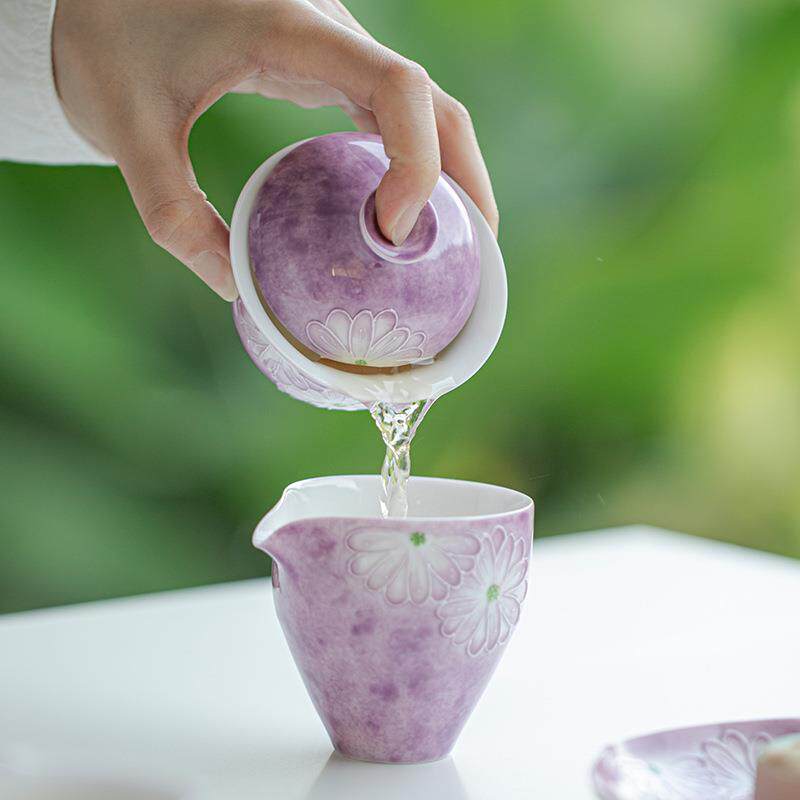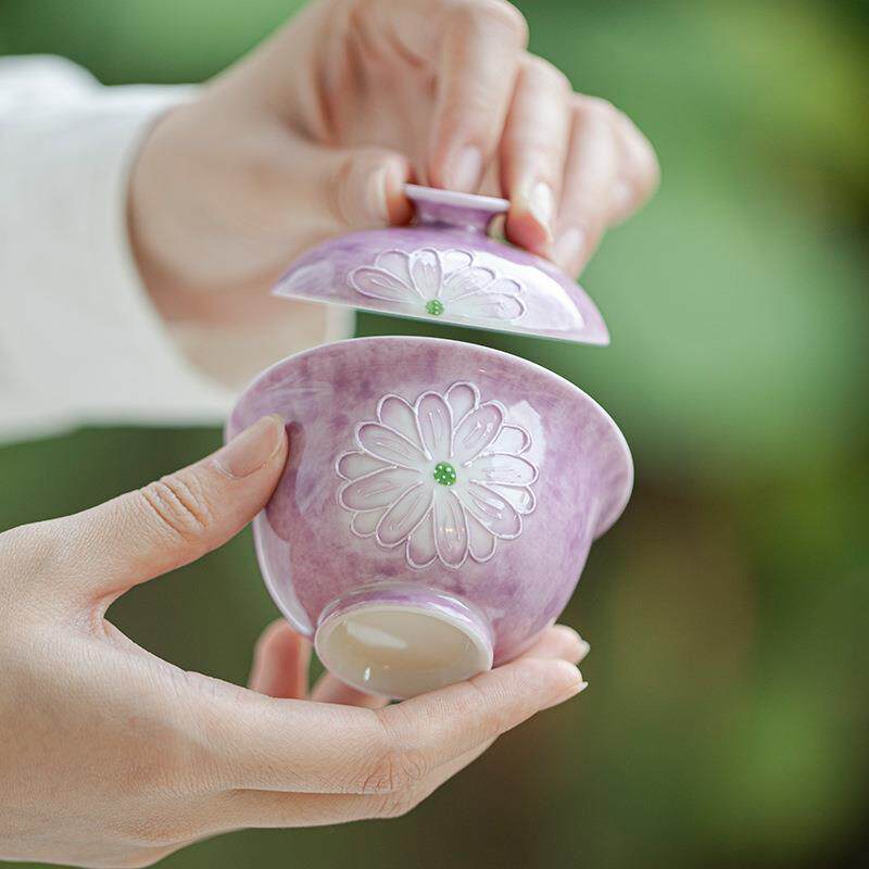 弥言豆蔻紫手工陶瓷薄胎盖碗釉下彩有田烧手绘雏菊泡茶碗茶杯家用