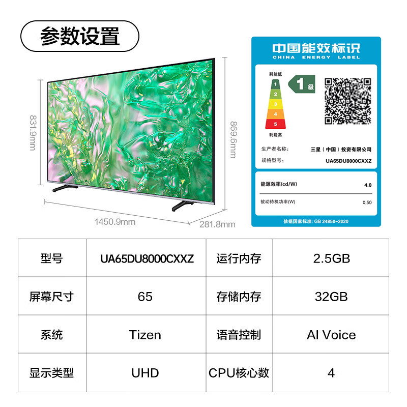 三星 65DU8000 65英寸LED 4K大屏液晶 智能电视 国家补贴15% 123