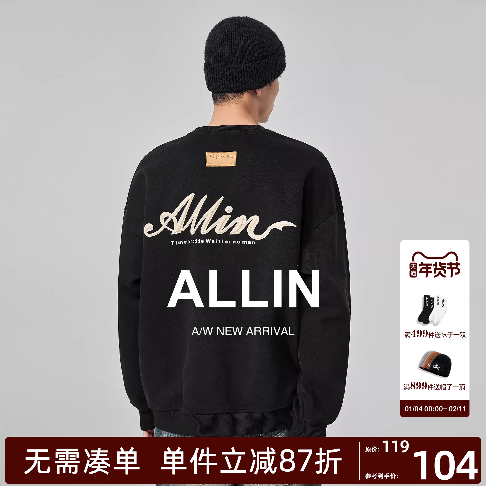 ALLIN 黑色重磅卫衣男秋冬字母印花无帽圆领打底情侣美式潮牌上衣