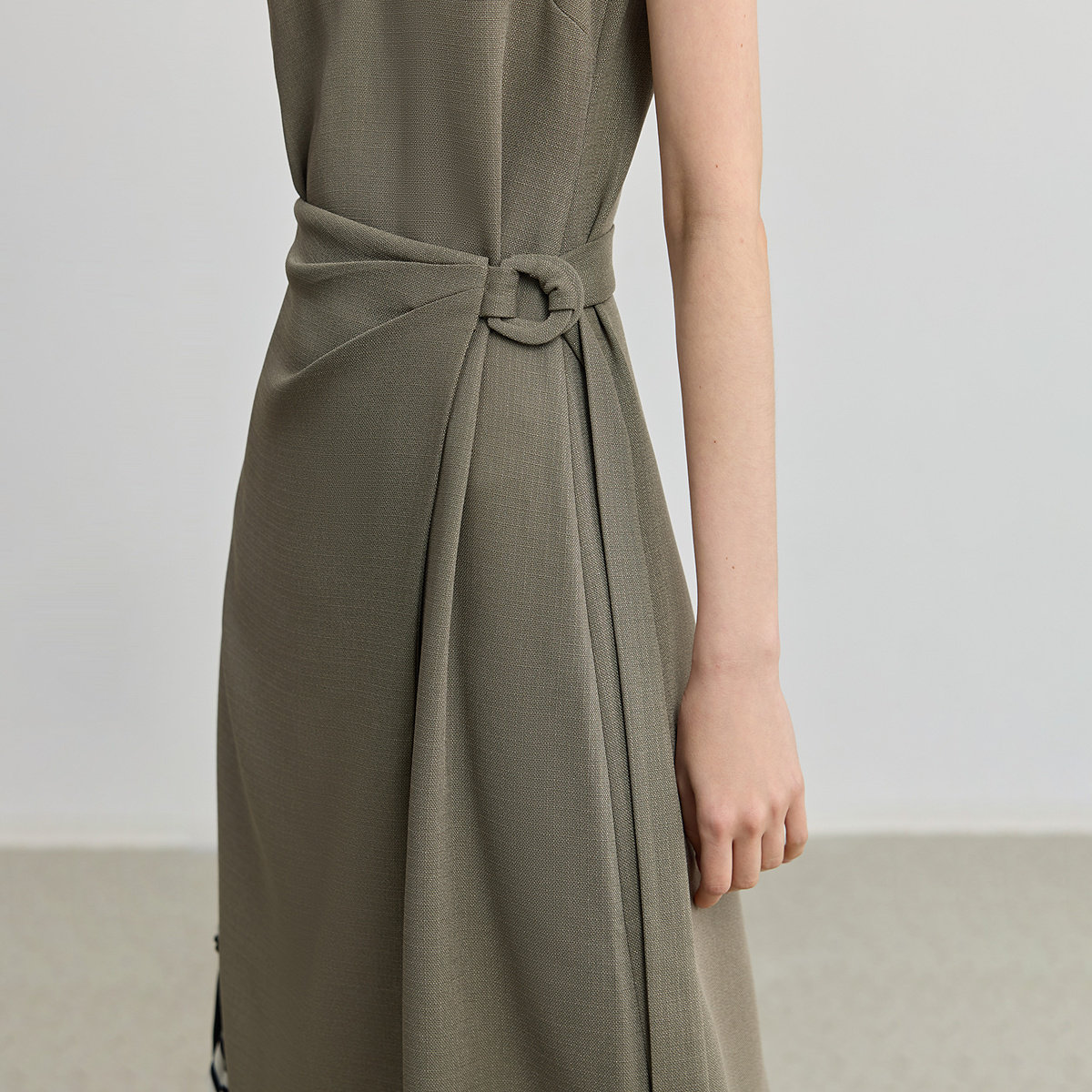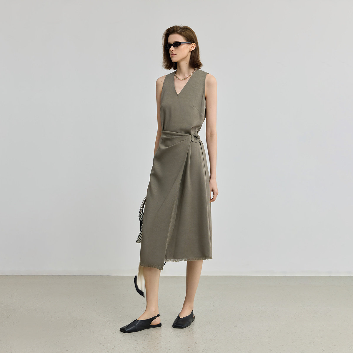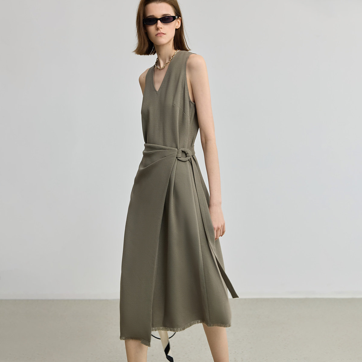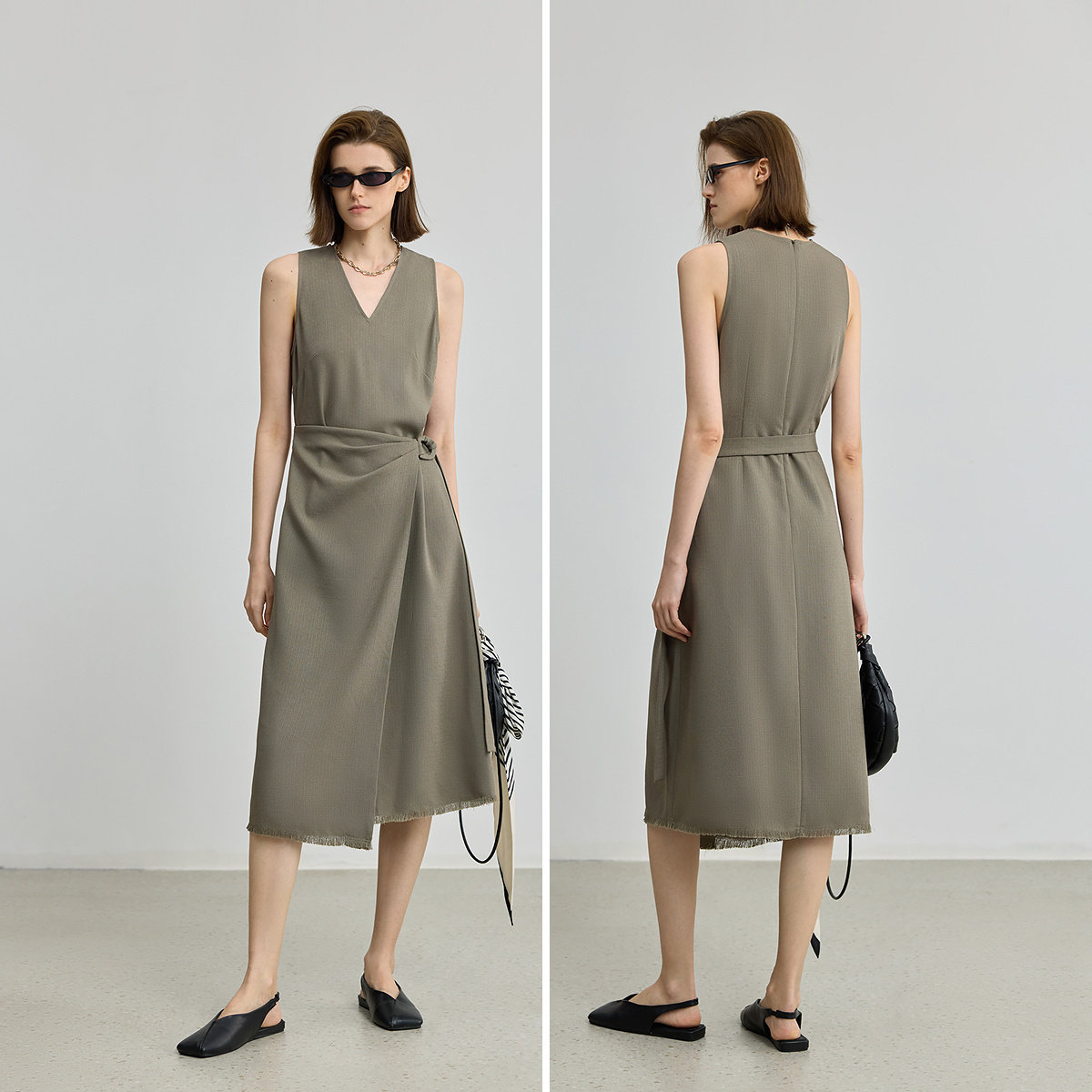 LILY2025新款醋酸混纺复古简约无袖V领不对称收腰连衣裙女长裙