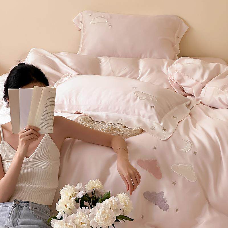 小清新云朵刺绣100S兰精天丝夏季裸睡床品粉色少女心被套床单套件
