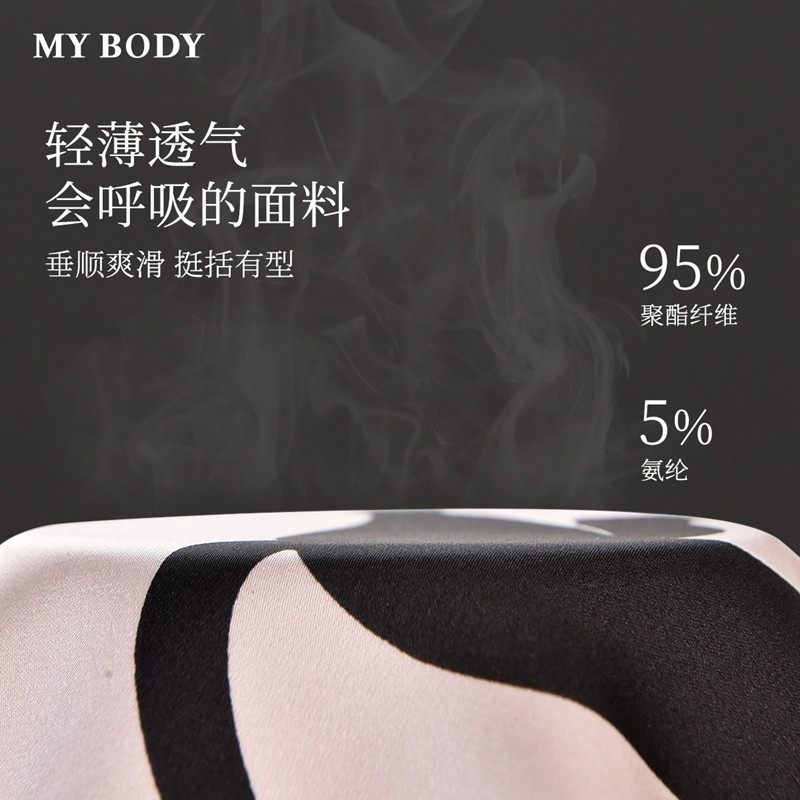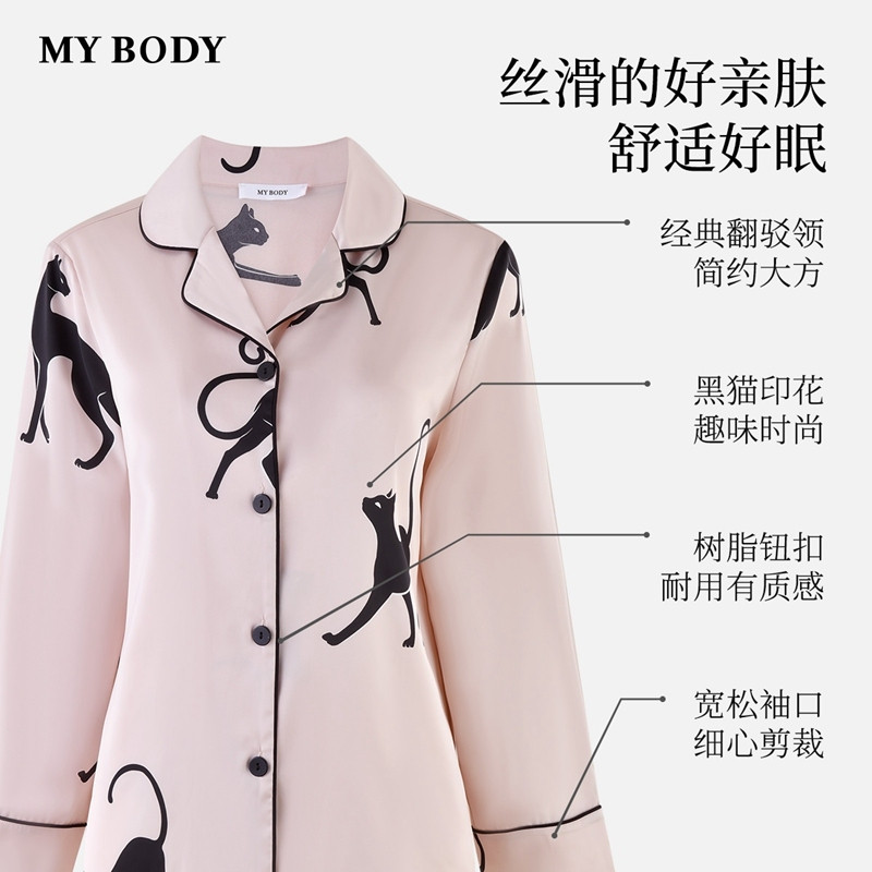 MYBODY商场同款睡衣女套装时尚黑猫印花缎面可外穿长袖家居服套装