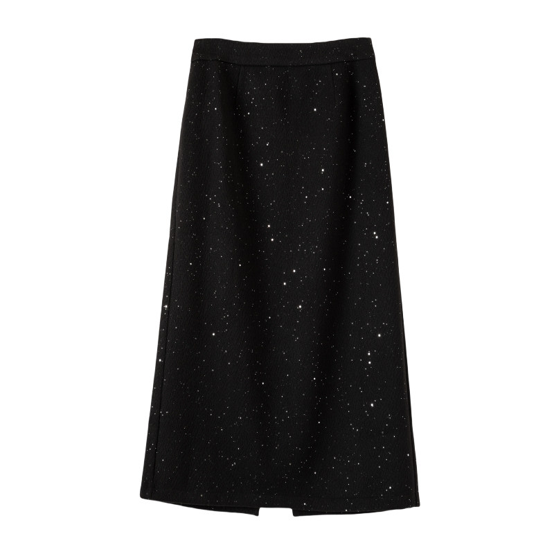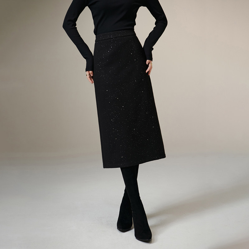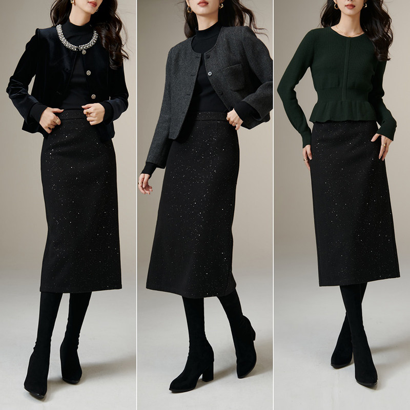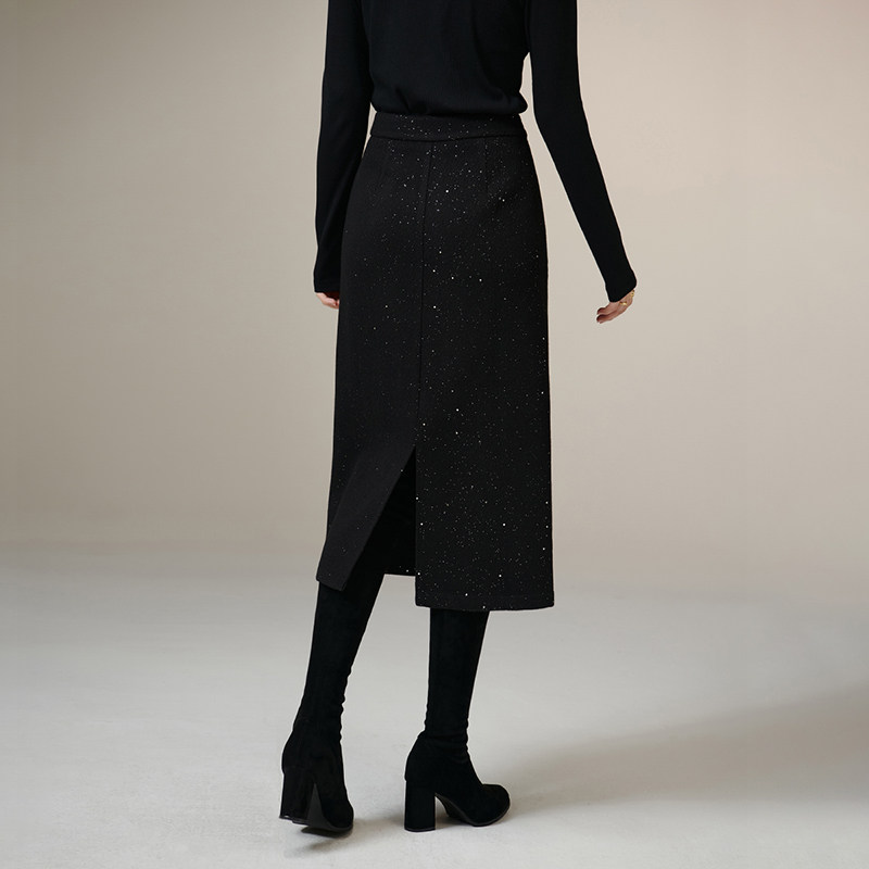 晚白秋冬新款洋气精致修身直筒裙亮闪闪半裙黑色毛呢半身裙女裙子