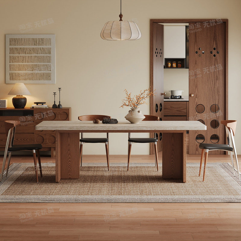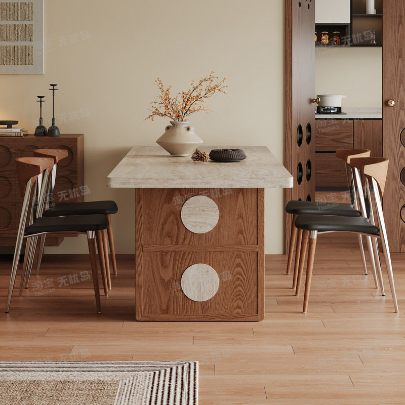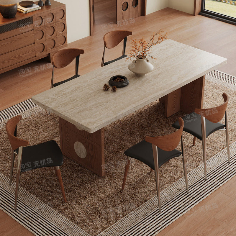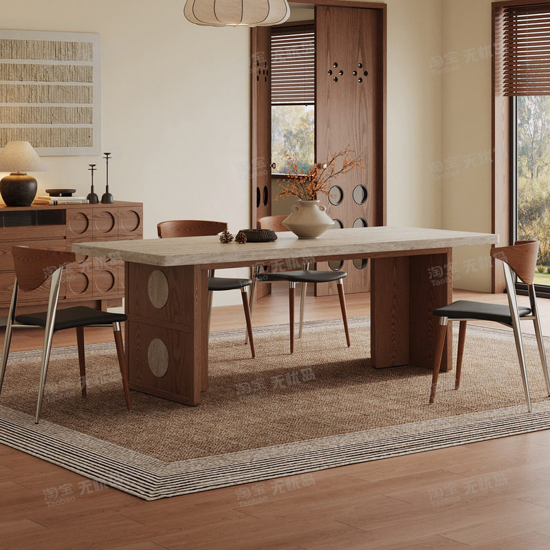 设计师款中古风实木洞石岩板餐桌椅组合家用小户型长方形岩板饭桌